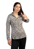 La camicia VLT's by Valentinas è realizzata con tessuto di viscosa davanti e maglina dietro, dal caratteristico motivo pitonato. Confortevole e alla moda, è perfetta per un look casual ma raffinato. Indossala per un tocco di eleganza e uno stile unico. Capo prodotto in Italia. Made in Italy.