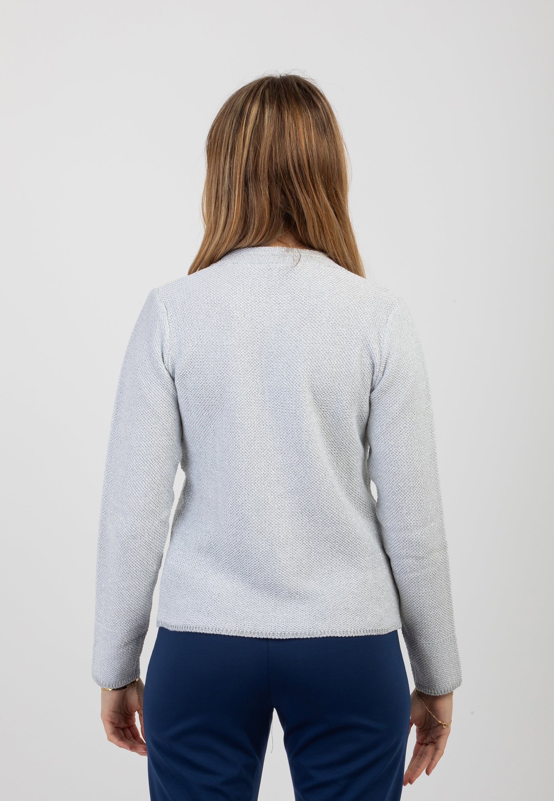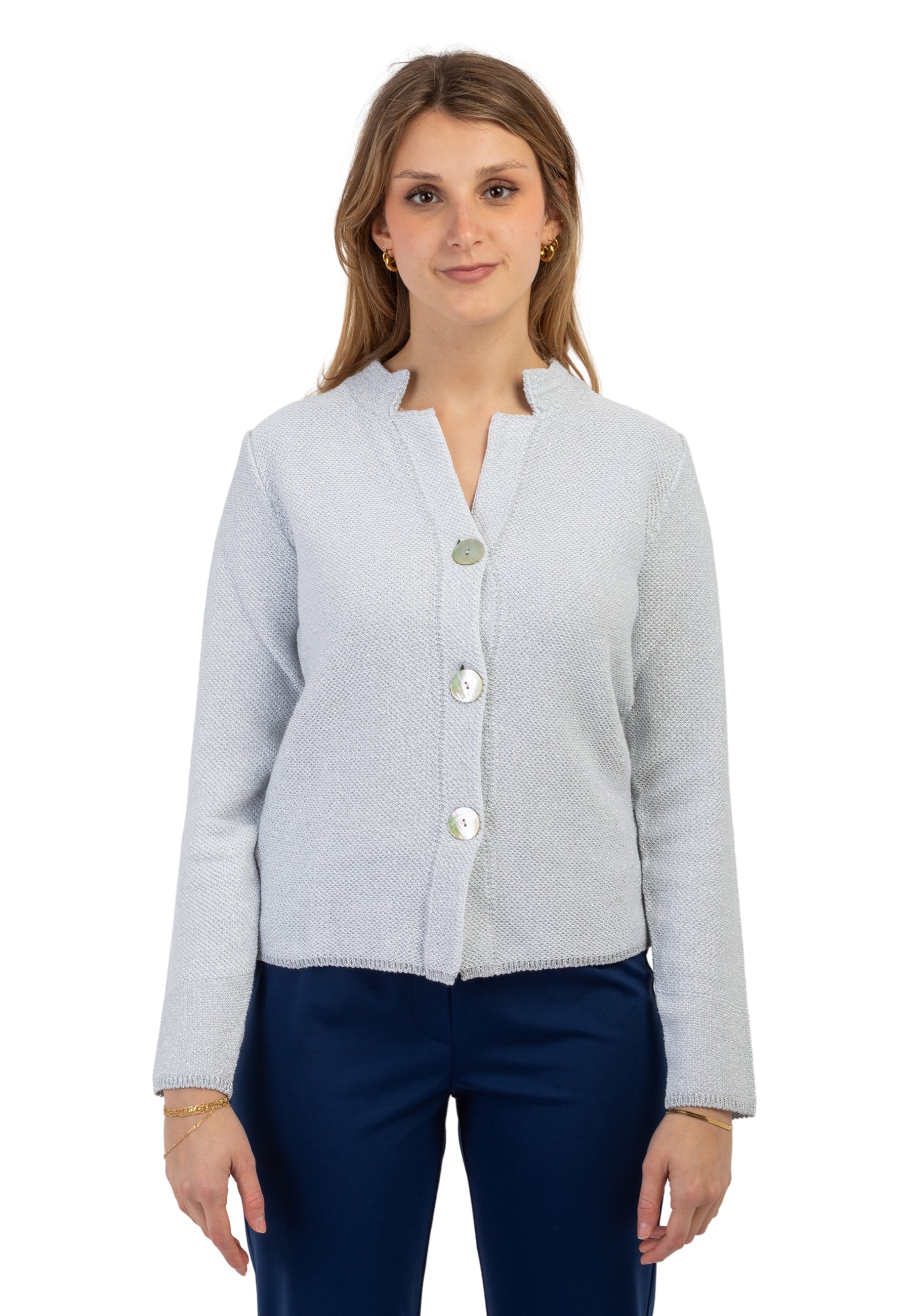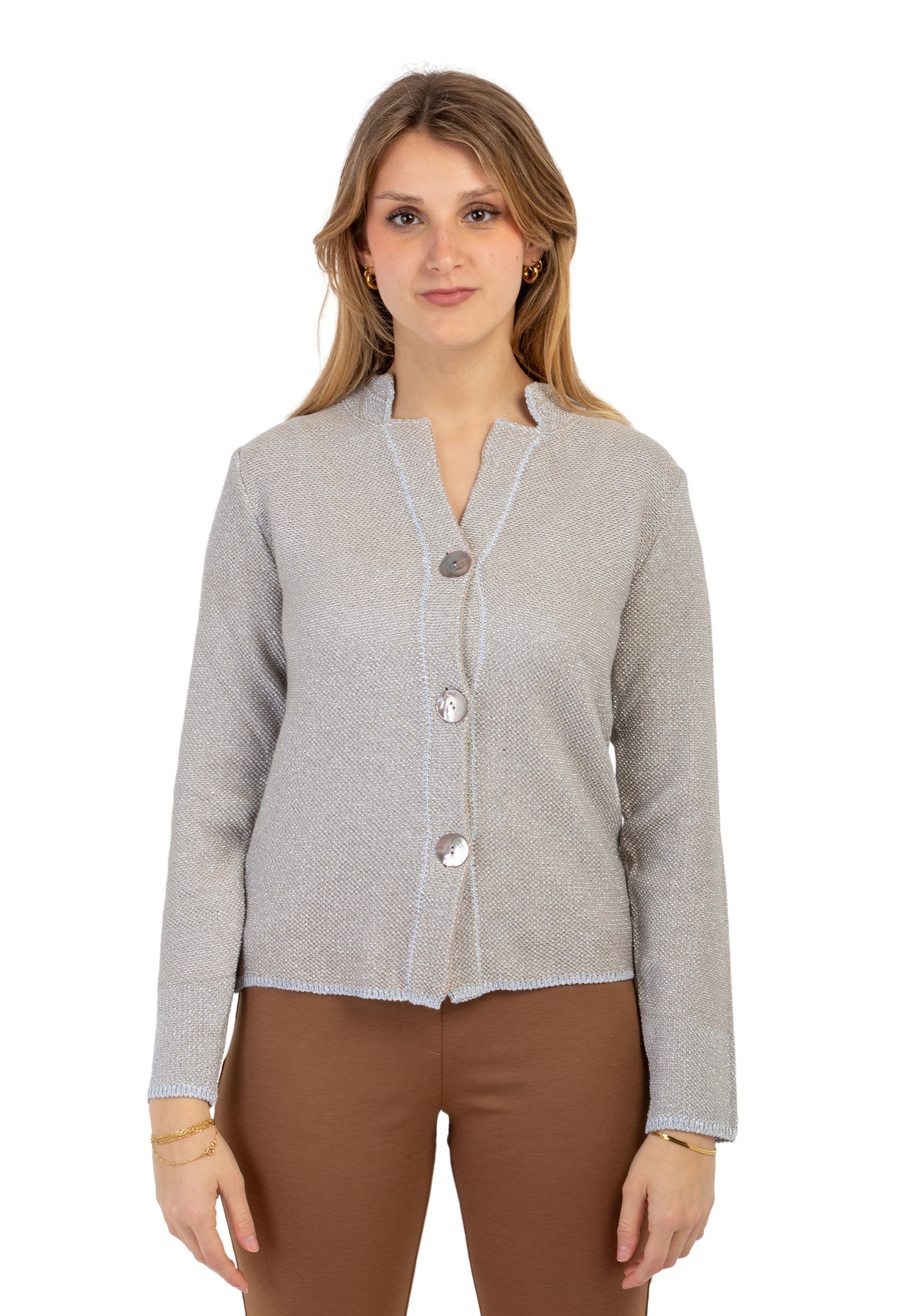 La giacca cardigan da donna di PREMODE è un capo raffinato e versatile, perfetto per aggiungere un tocco di eleganza a qualsiasi outfit. Realizzata in maglia punto riso con una pregiata combinazione di cotone e viscosa, offre una vestibilità morbida e confortevole, ideale per ogni stagione. Gli inserti in lurex donano un delicato effetto luminoso, valorizzando il design con una nota di stile sofisticato. La chiusura con tre bottoni aggiunge un dettaglio classico e pratico, rendendo questo cardigan perfetto sia per look casual che per occasioni più ricercate. Un capo essenziale nel guardaroba di ogni donna che ama vestirsi con classe e femminilità senza rinunciare al comfort. Capo prodotto in Italia. Made in Italy.