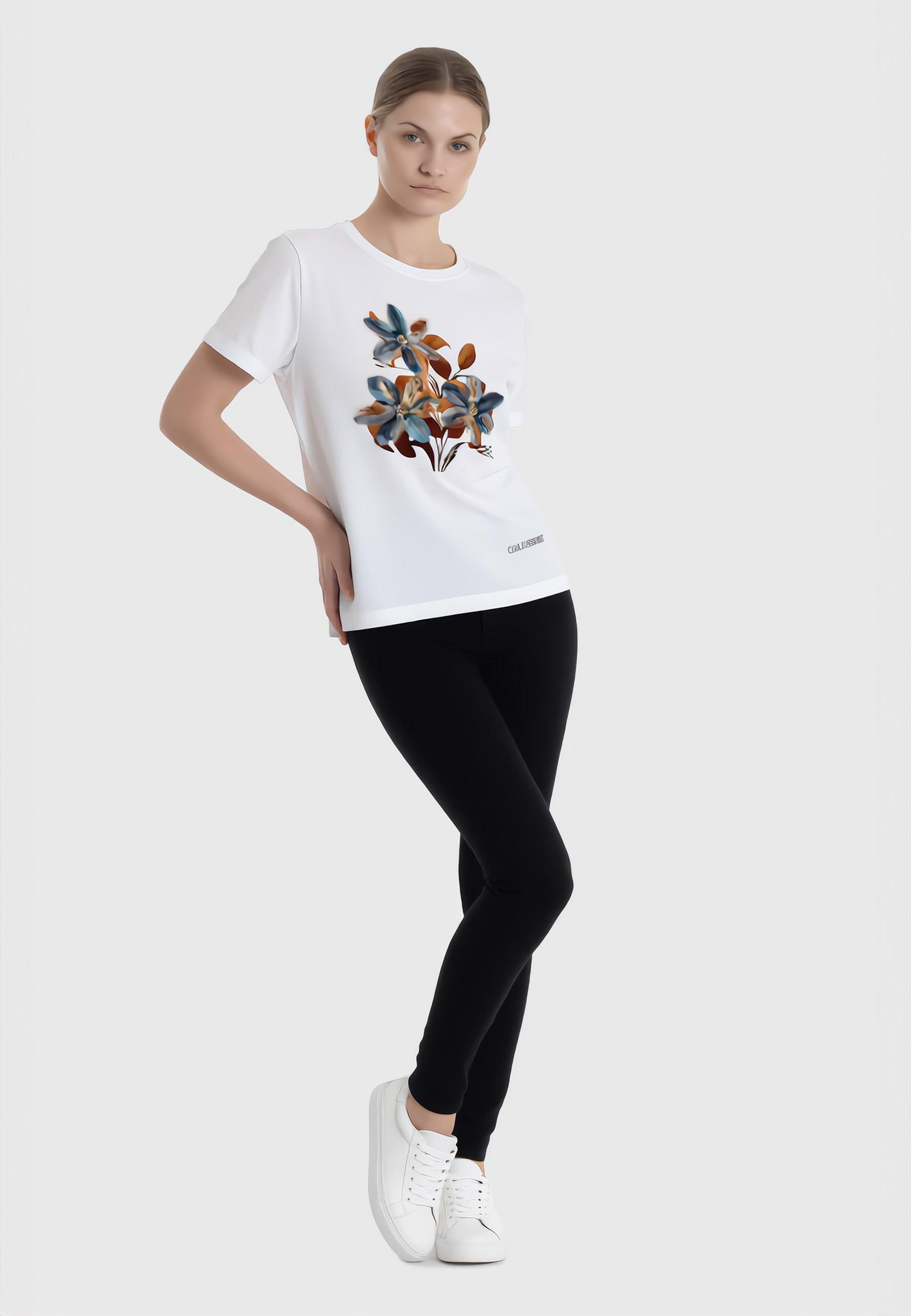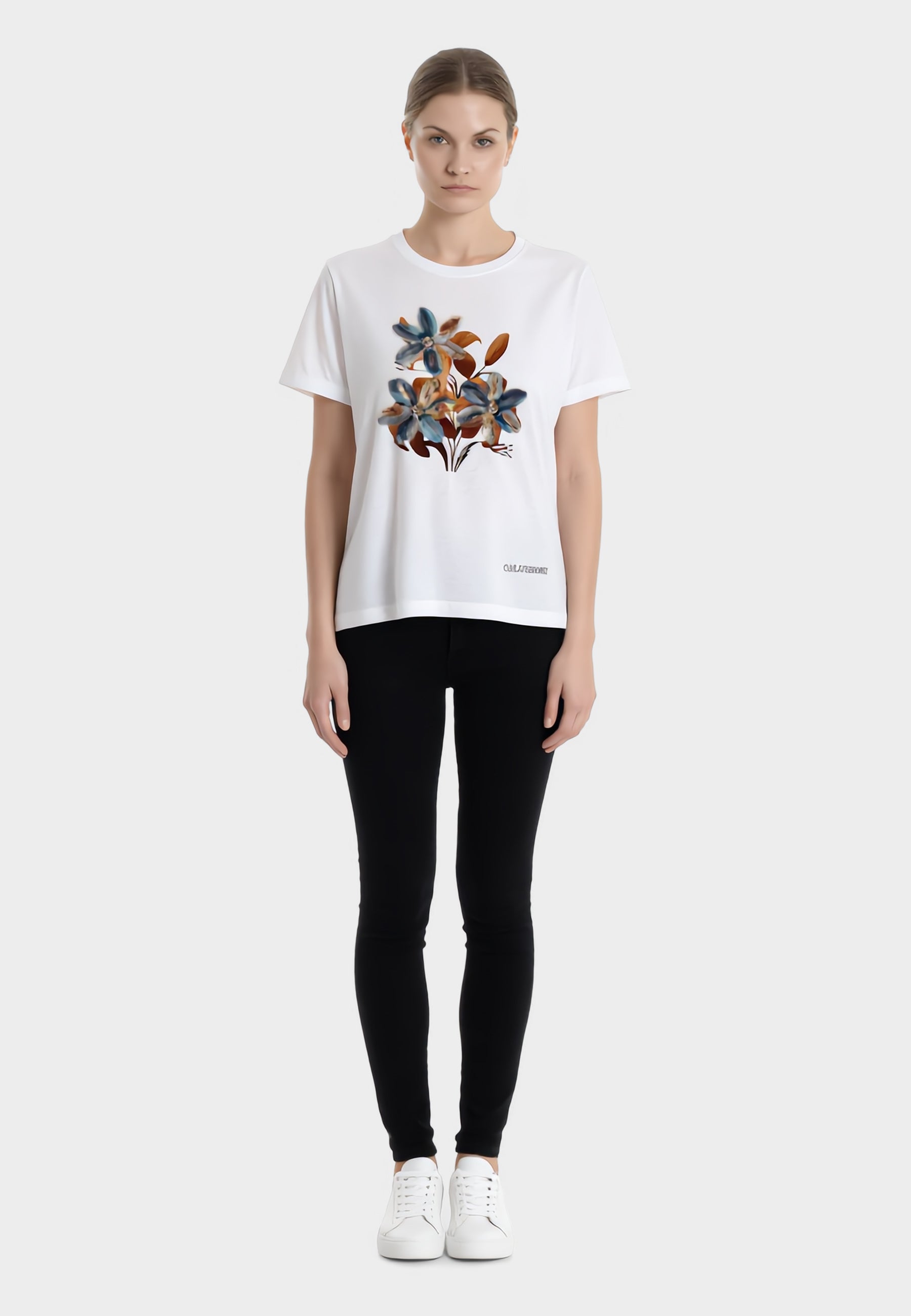 T-shirt donna CARLA FERRONI dal design essenziale impreziosito da dettagli raffinati, ideale per uno stile quotidiano elegante e contemporaneo. Il modello presenta una linea pulita con vestibilità regolare che valorizza la figura senza costrizioni, risultando perfetto per ogni momento della giornata. Il girocollo classico e le maniche corte rendono il capo pratico e versatile, facilmente abbinabile sia a look casual sia a outfit più curati. Il punto focale è rappresentato dall’applicazione floreale frontale, arricchita da perline che donano luminosità e un tocco femminile ricercato, accompagnata dal logo discreto del brand. Il tessuto in viscosa elasticizzata garantisce morbidezza, leggerezza e comfort sulla pelle, assicurando una vestibilità fluida e piacevole anche nelle giornate più calde. Firmata CARLA FERRONI, questa t-shirt è la scelta ideale per chi cerca un capo basico ma distintivo, capace di elevare ogni abbinamento con eleganza.