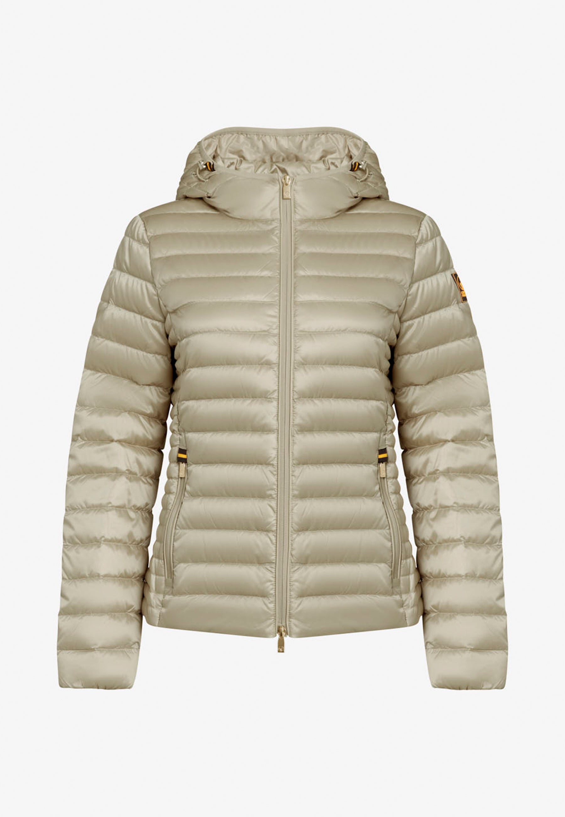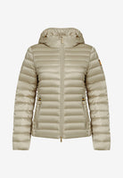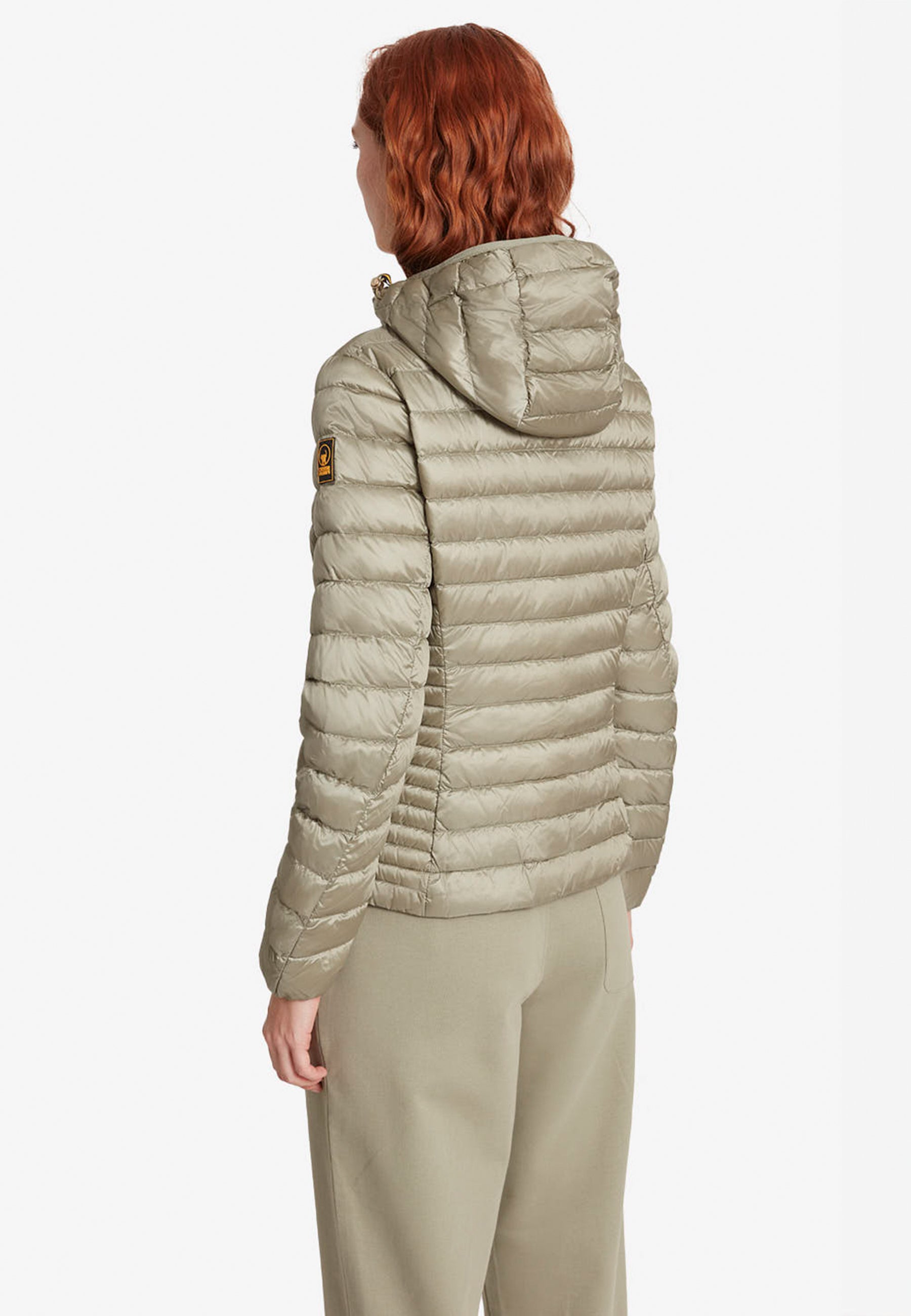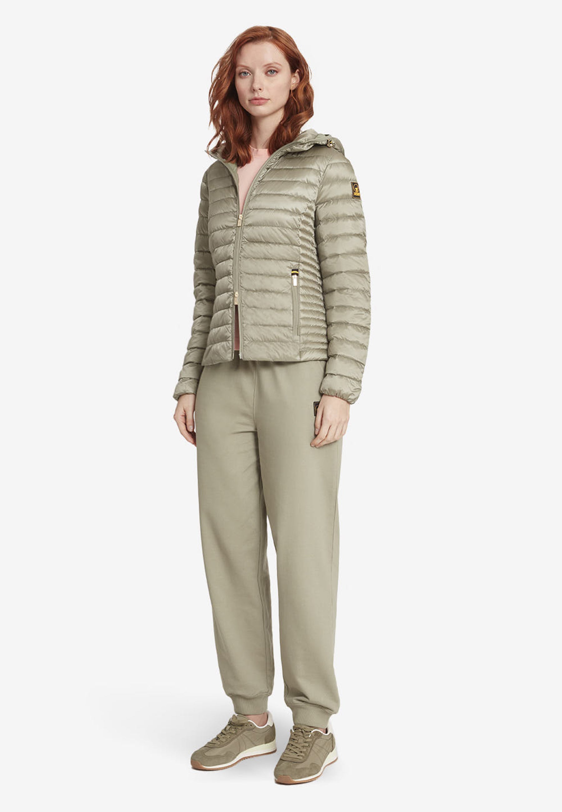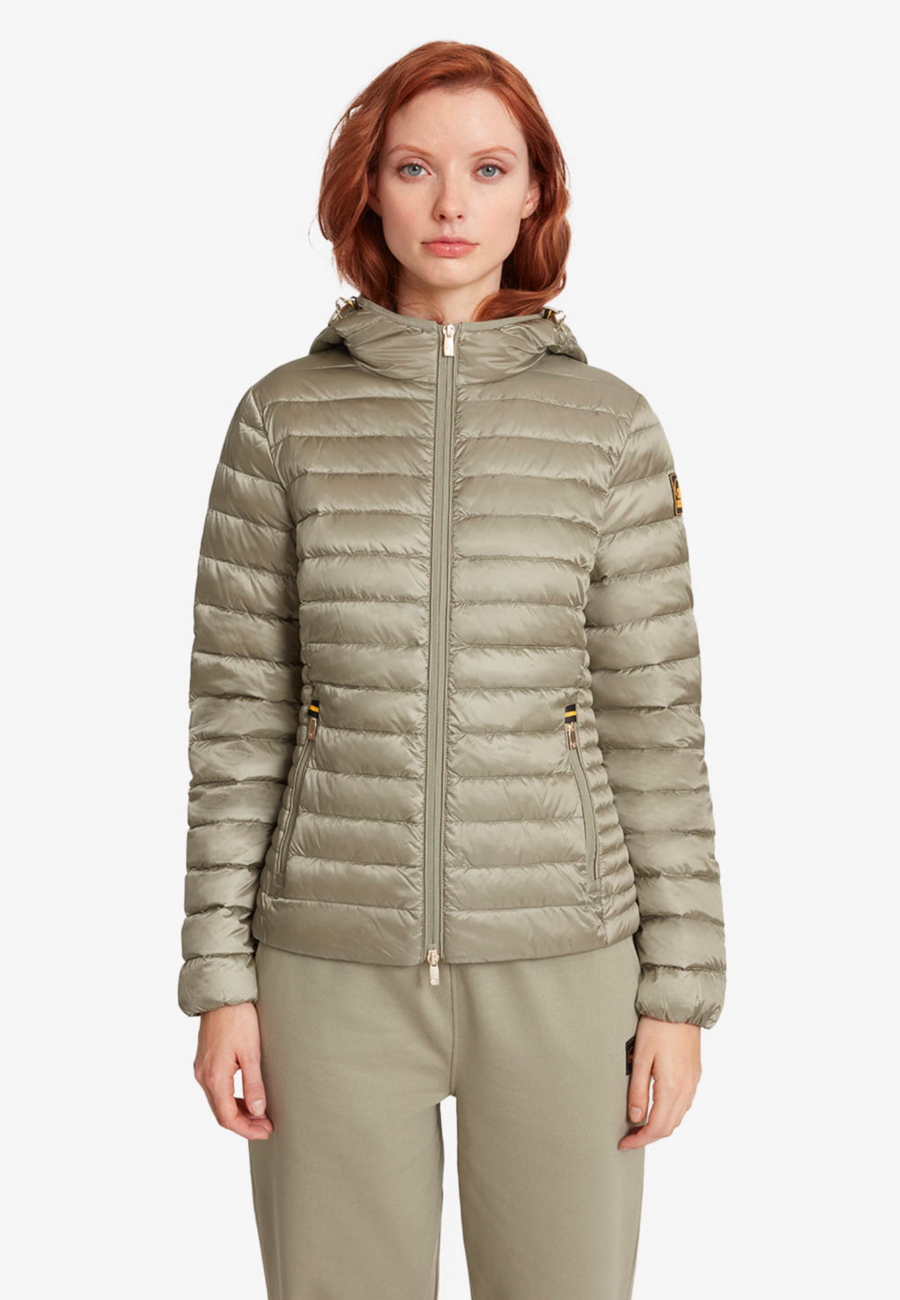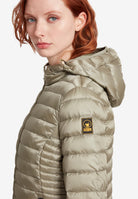 Piumino donna Ciesse Piumini corto da 100 grammi con imbottitura in piuma d’oca e cappuccio fisso, ideale per offrire protezione leggera, comfort termico e stile urbano contemporaneo.