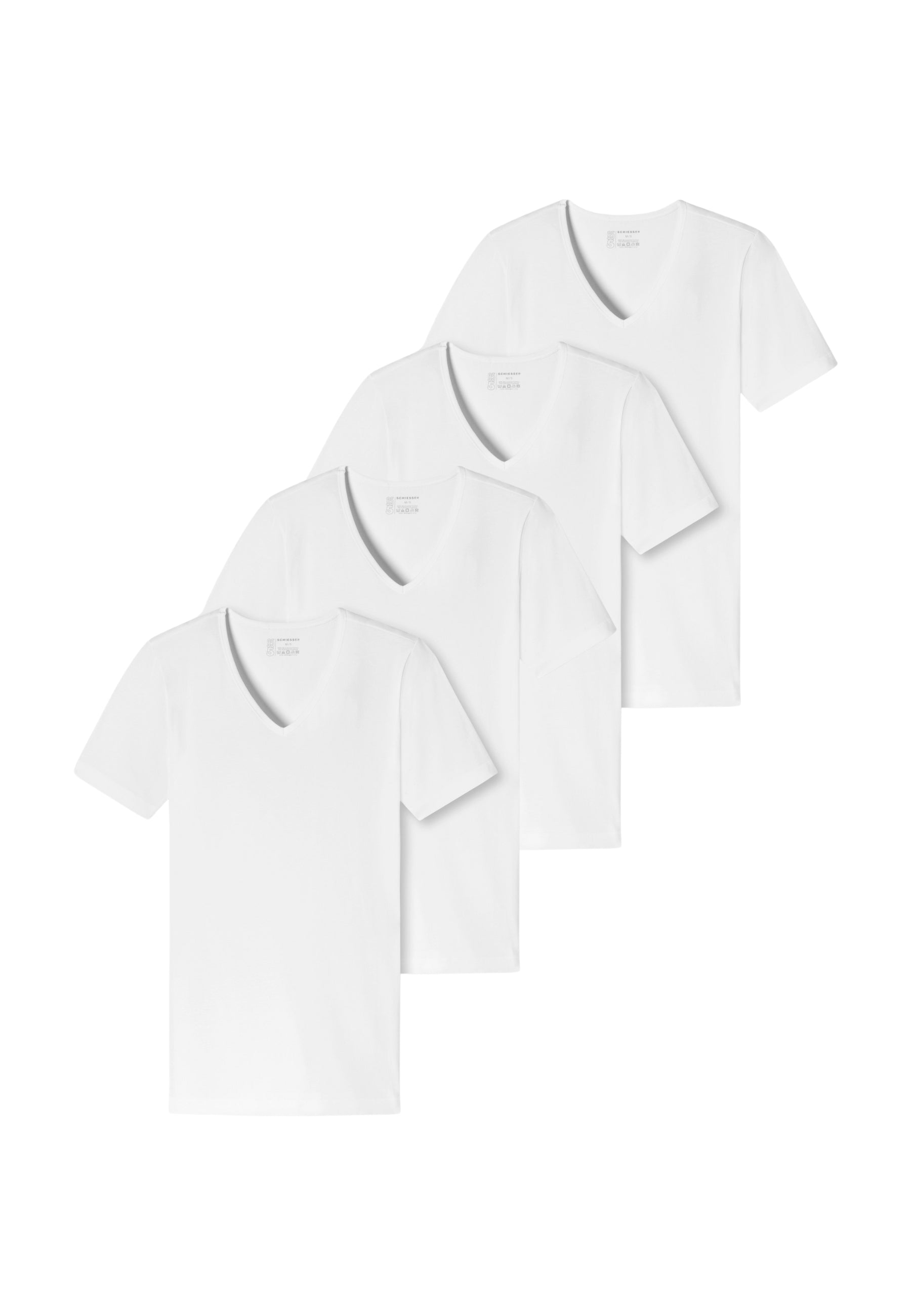 4 maglie intime da uomo mezze maniche a scollo a v della storica linea 95/5 della Schiesser. Realizzate in un morbido e comodo cotone elasticizzato, garantiscono un confort unico. Inoltre, grazie al cotone organico sostenibile testato nei laboratori Schiesser, queste maglie garantiscono una durata unica.