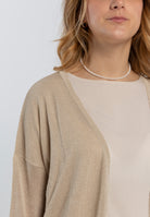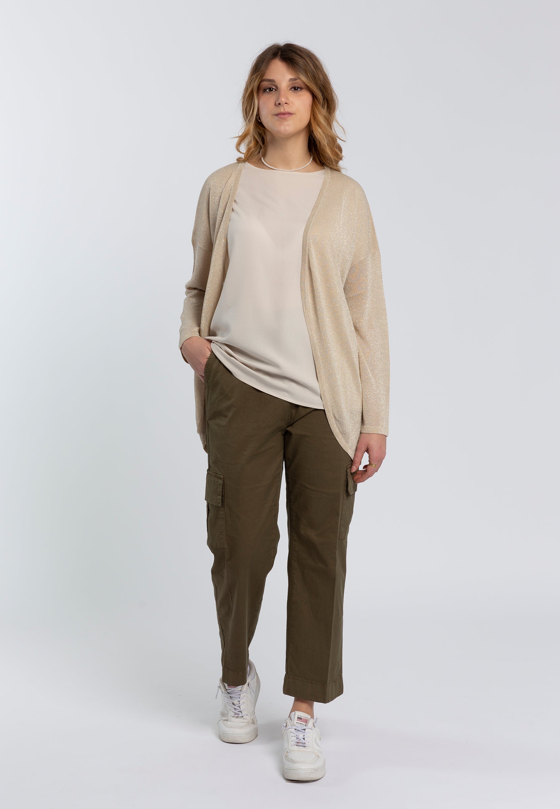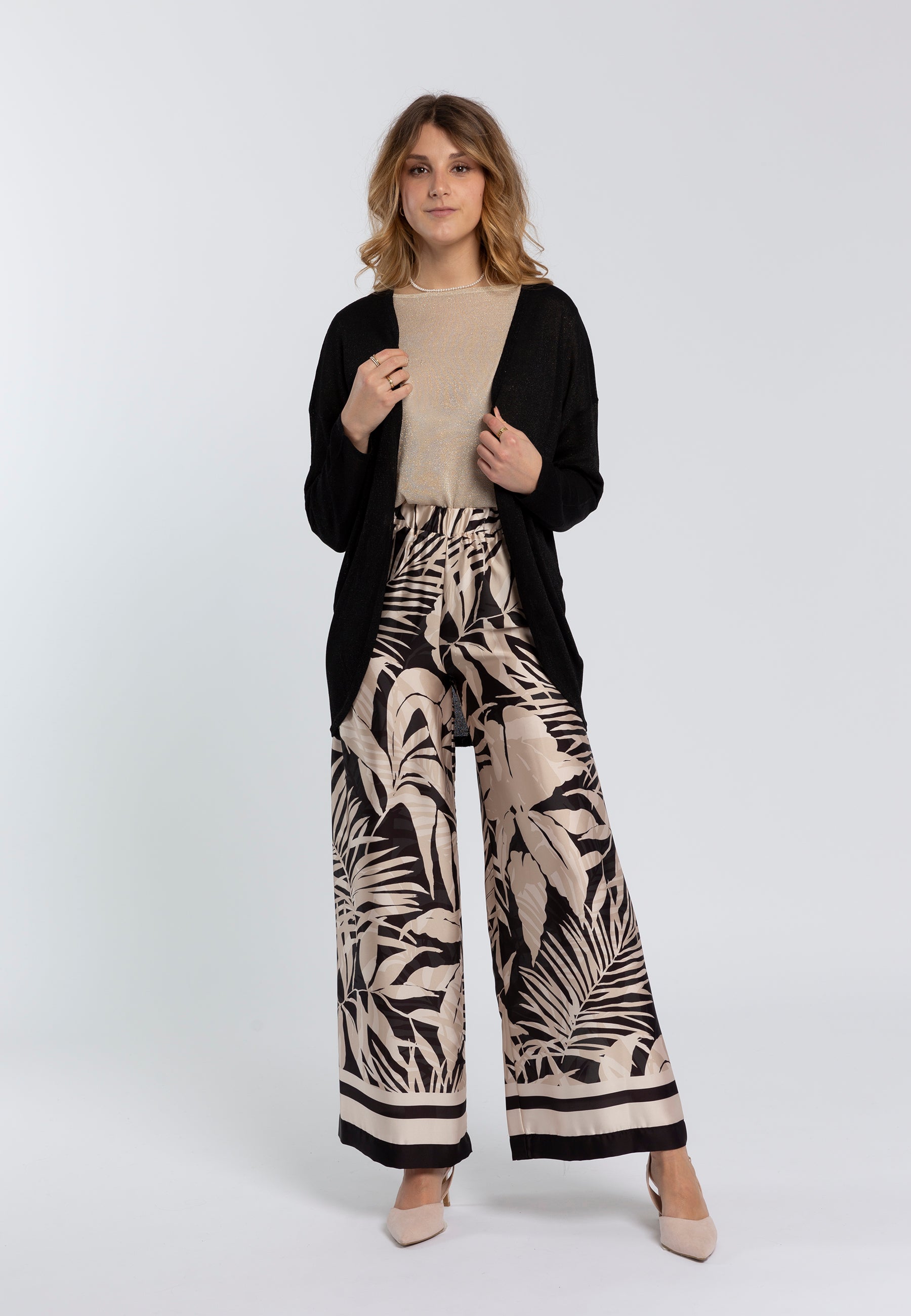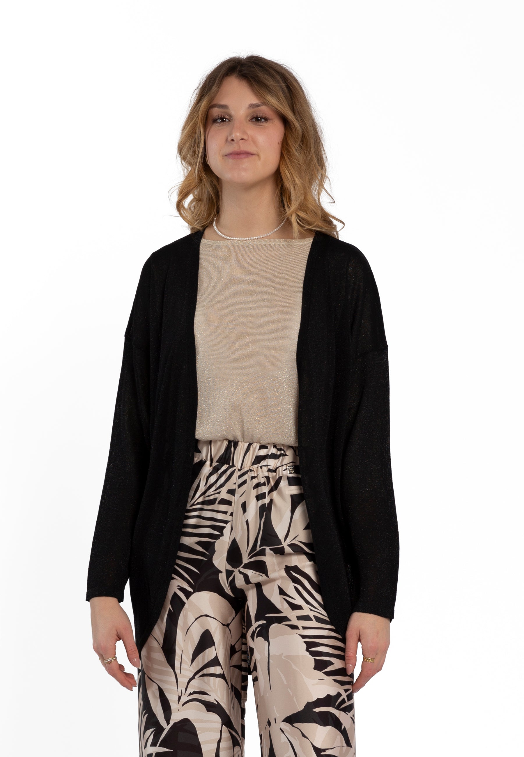 Questo coprispalle è realizzato in leggera maglia di viscosa e lamè, conferendo un elegante tocco fresco e leggero. La sua composizione di materiali di alta qualità offre una vestibilità comoda e un aspetto sofisticato, perfetto per ogni occasione. Ideale per aggiungere un tocco di stile e raffinatezza al tuo look.