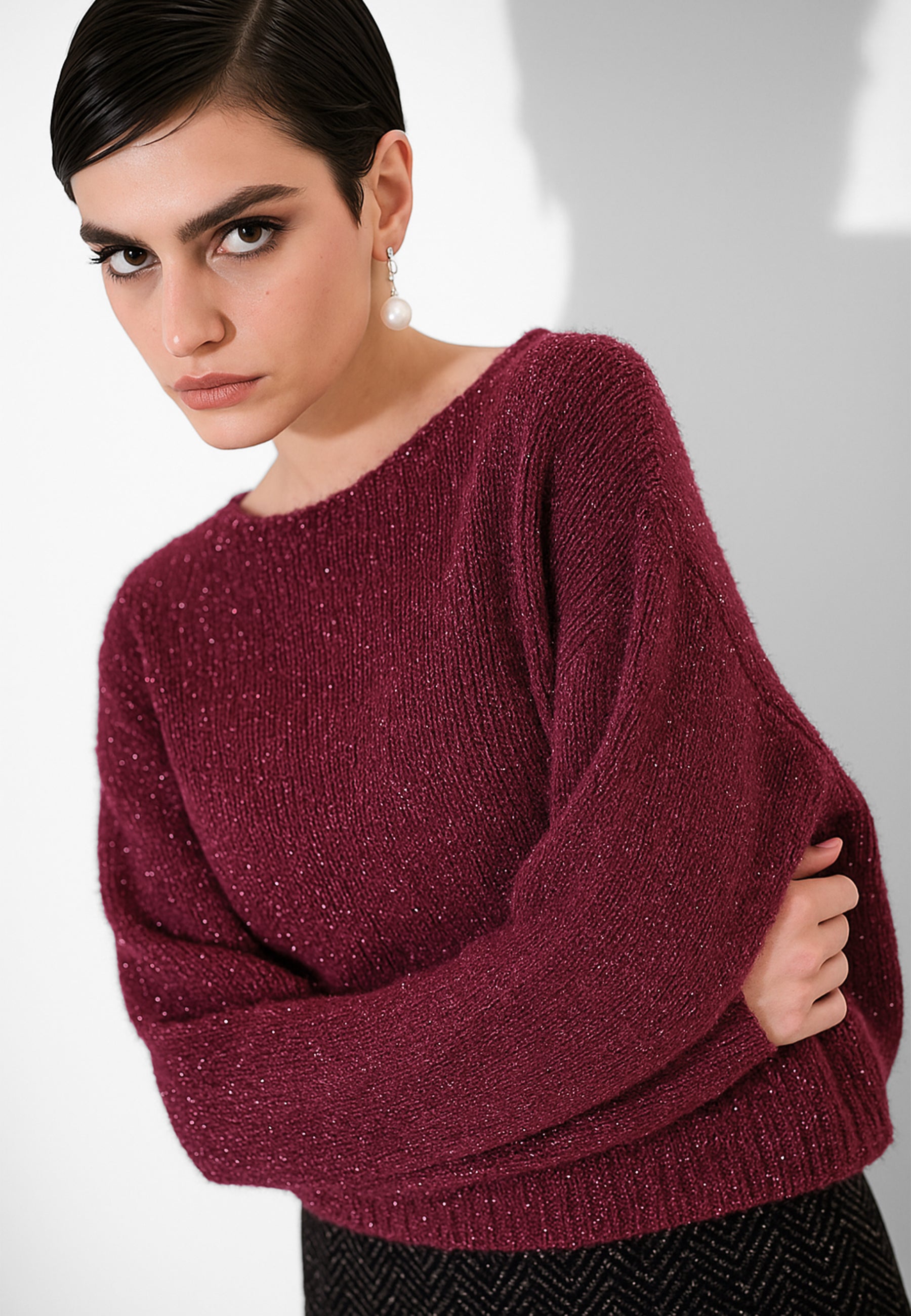 Maglia con lurex e collo a barchetta, con manica lunga. Questo capo valorizza la silhouette con una linea moderna ed è pensato per completare look casual e raffinati. Perfetto per la stagione autunno inverno, unisce comfort e stile per un uso quotidiano versatile. Capo prodotto in Italia, Made in Italy