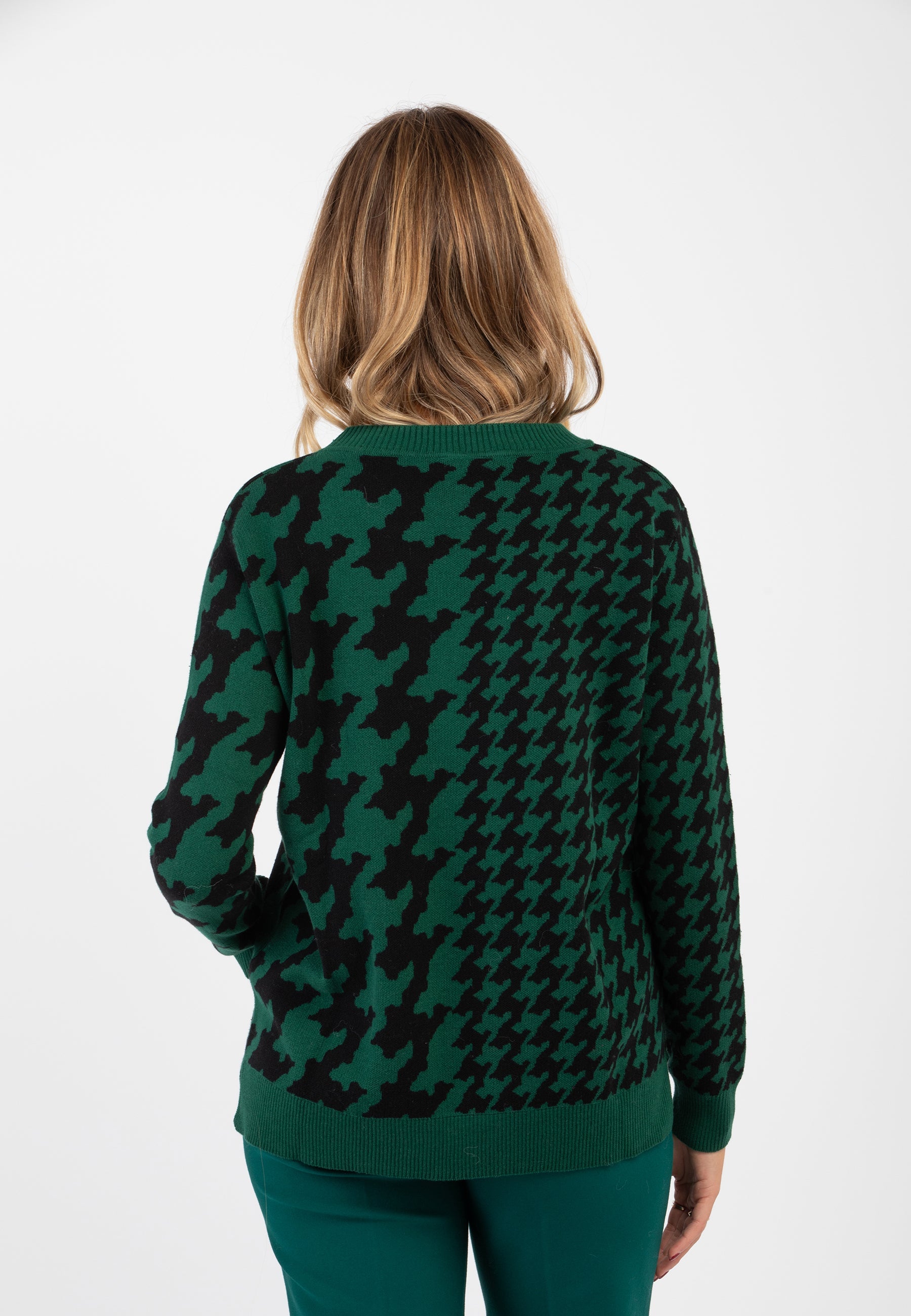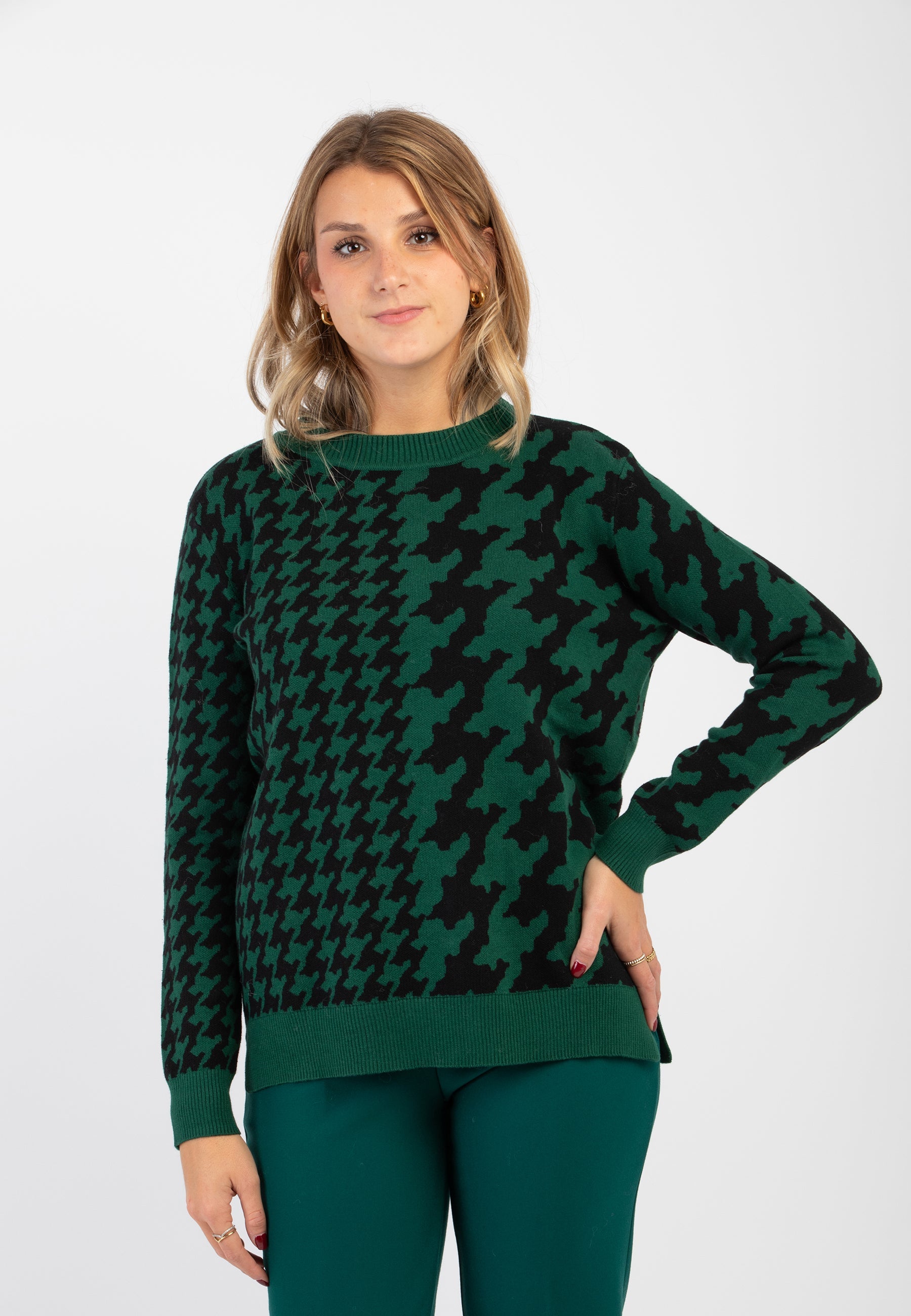 Maglia della Ragno Donna realizzata in cotone puro di alta qualità e con un tessuto di finezza 12, questa maglia girocollo da donna è calda e confortevole. La stampa a fantasia pied de poule a contrasto con i dettagli tinta unita crea un effetto visivo dinamico e originale. Il modello presenta spacchetti laterali e polsini tinta unita, rendendolo adatto per diverse occasioni, sia casual che formali.