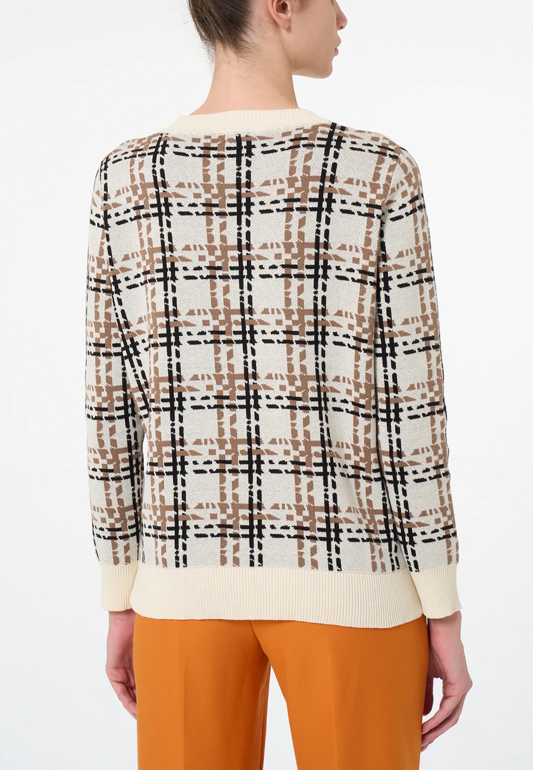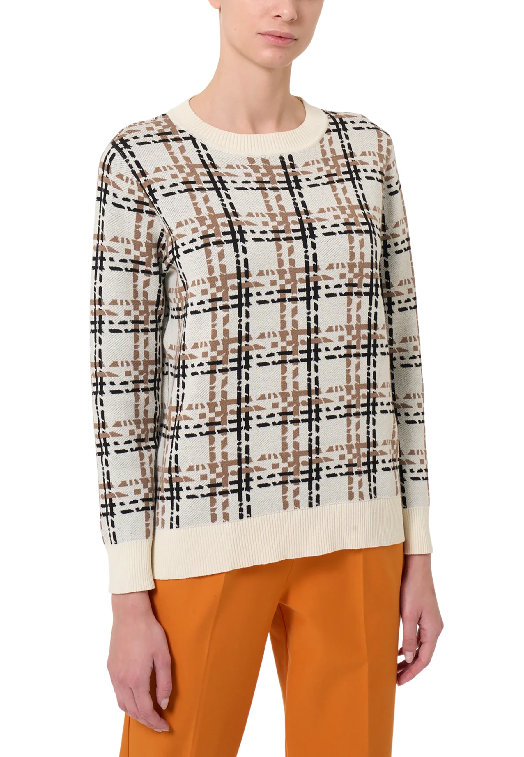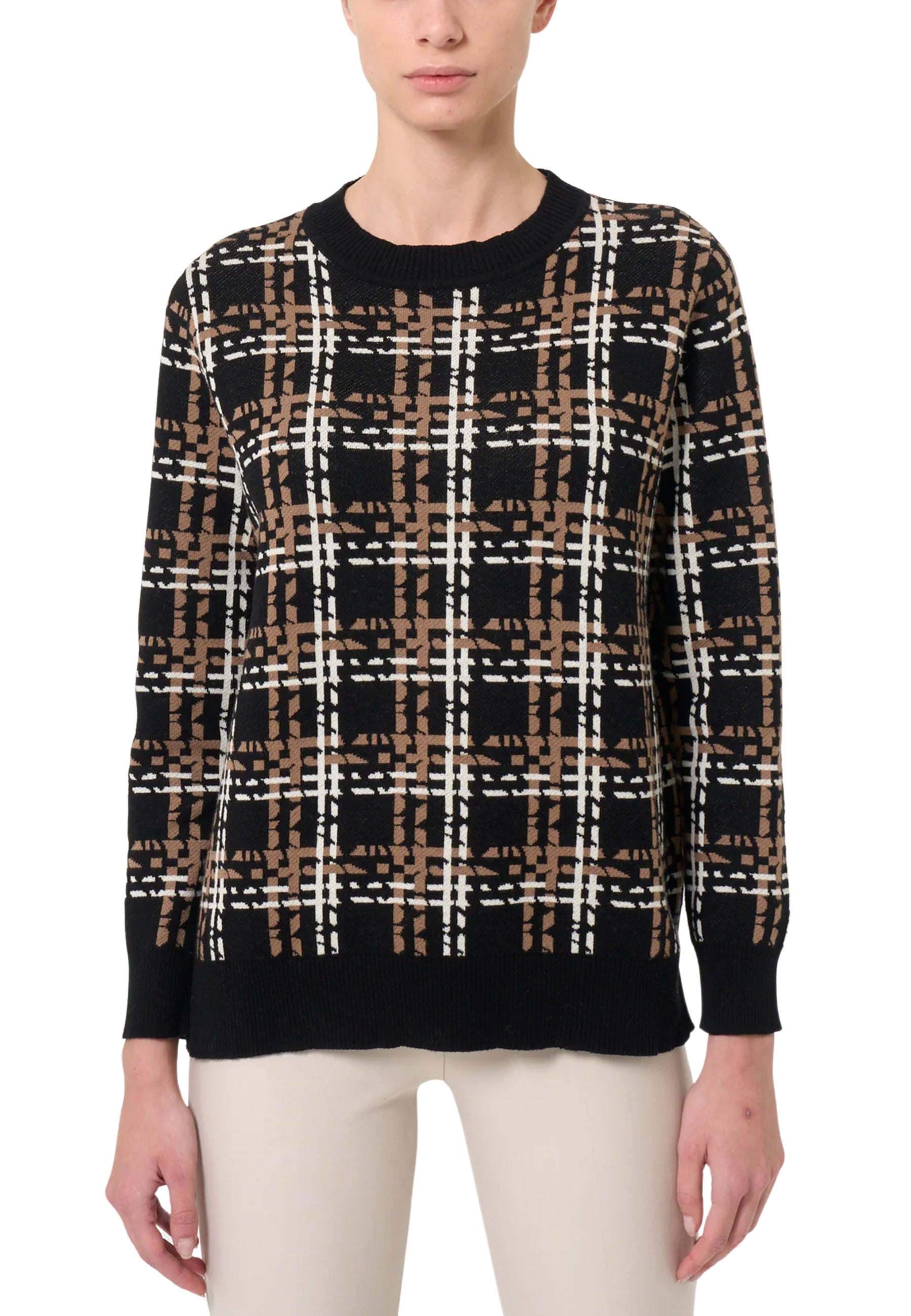 Scopri la maglia girocollo da donna in puro cotone, tessuto in finezza 12 per un comfort caldo e avvolgente. Con una stampa jacquard check multicolore, questo capo dinamico e intrigante aggiunge un tocco unico al tuo look trendy ed elegante. Con vestibilità morbida, si adatta perfettamente a tutte le forme fisiche.