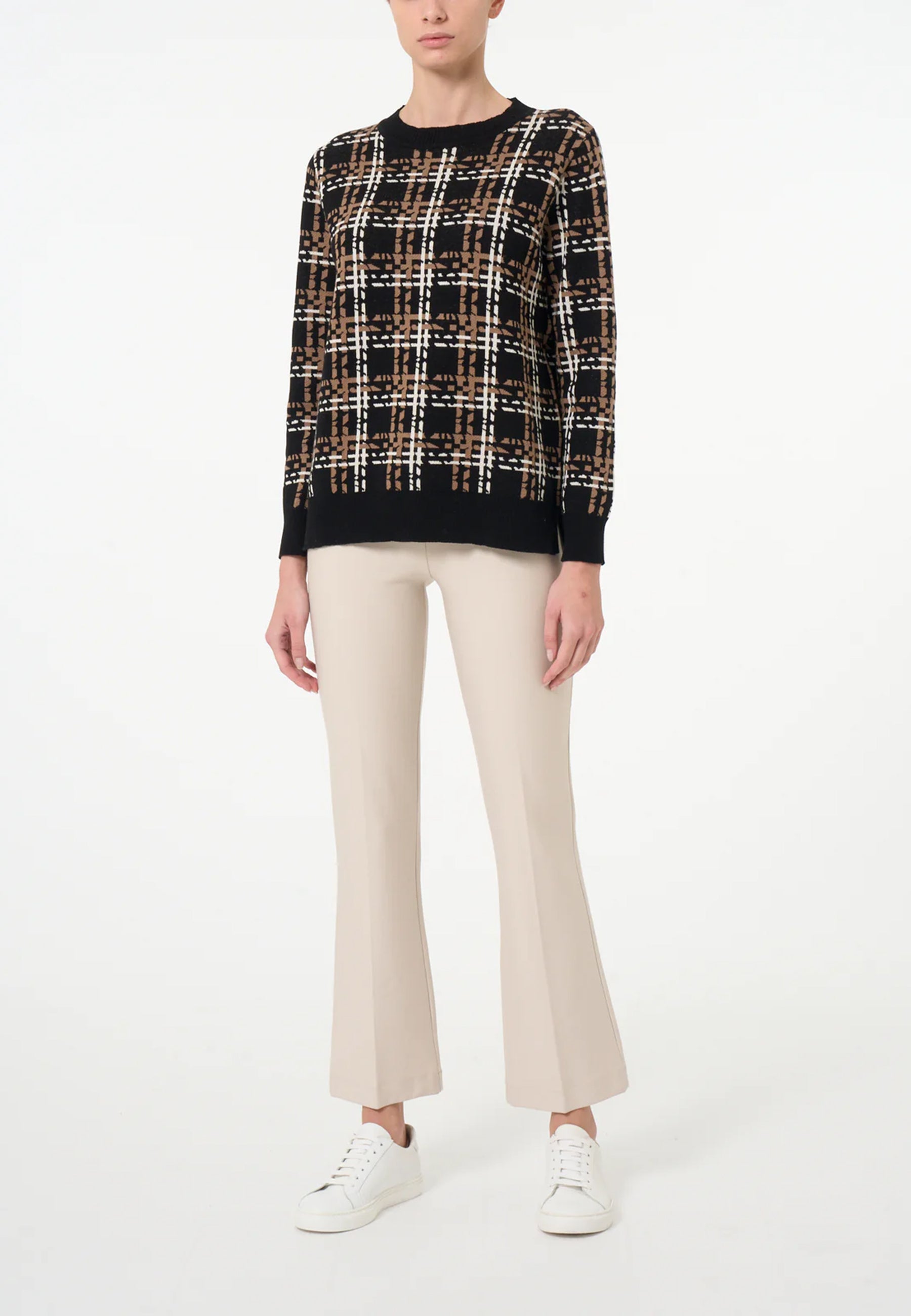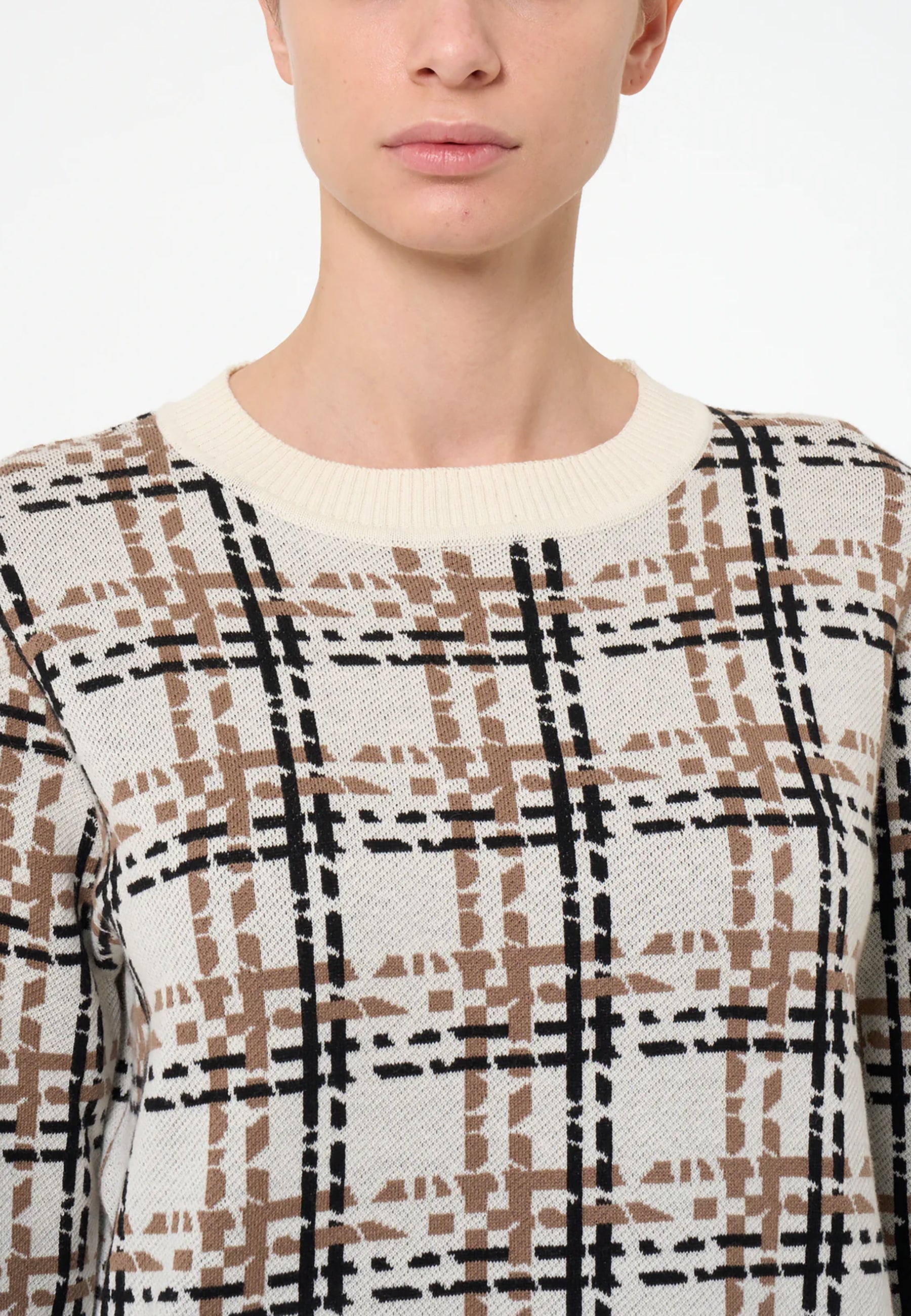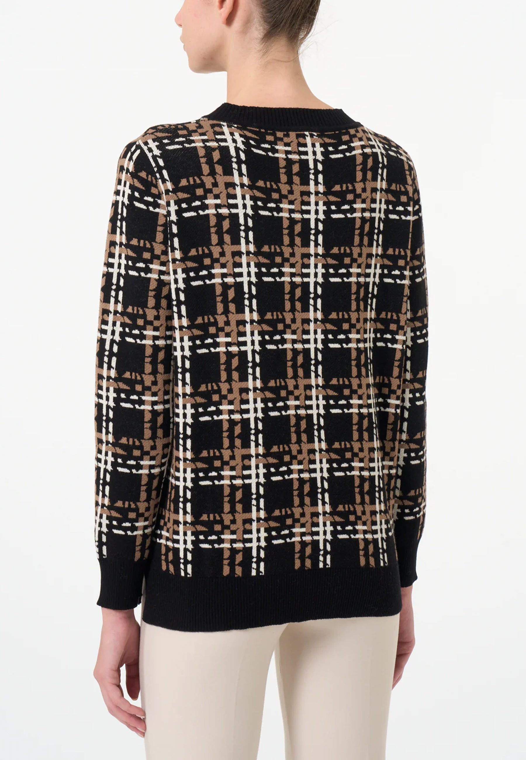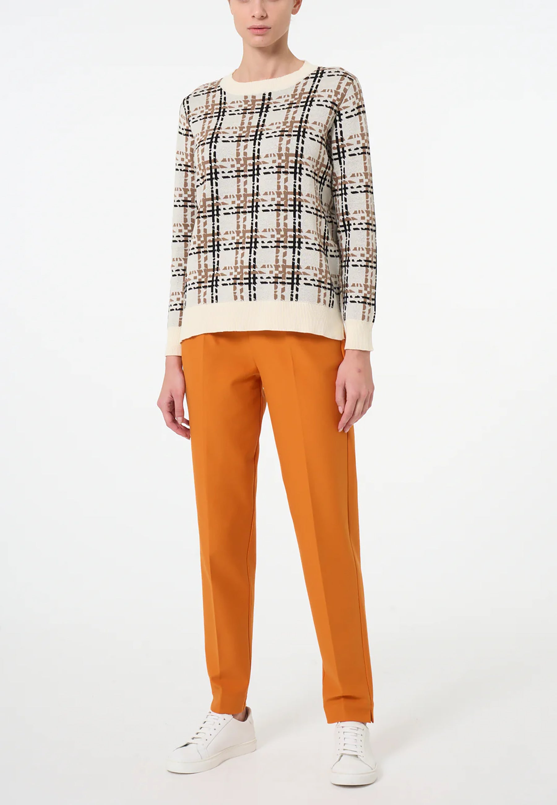 Scopri la maglia girocollo da donna in puro cotone, tessuto in finezza 12 per un comfort caldo e avvolgente. Con una stampa jacquard check multicolore, questo capo dinamico e intrigante aggiunge un tocco unico al tuo look trendy ed elegante. Con vestibilità morbida, si adatta perfettamente a tutte le forme fisiche.