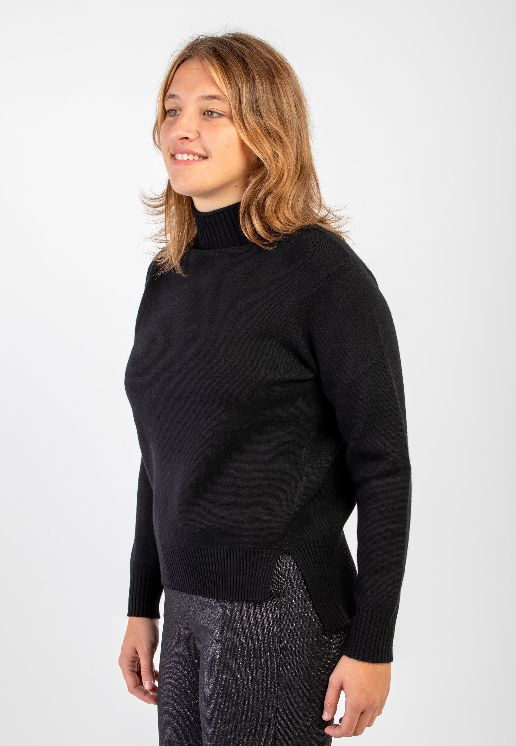 La Maglia a lupetto da donna in viscosa è caldo, morbido e pratico con una tessitura finezza 12. Le aperture laterali, i polsini e il design asimmetrico lo rendono moderno e dinamico. La vestibilità boxy e il collo lupetto offrono comfort e protezione durante le giornate più fredde.