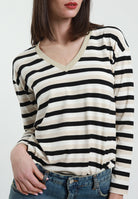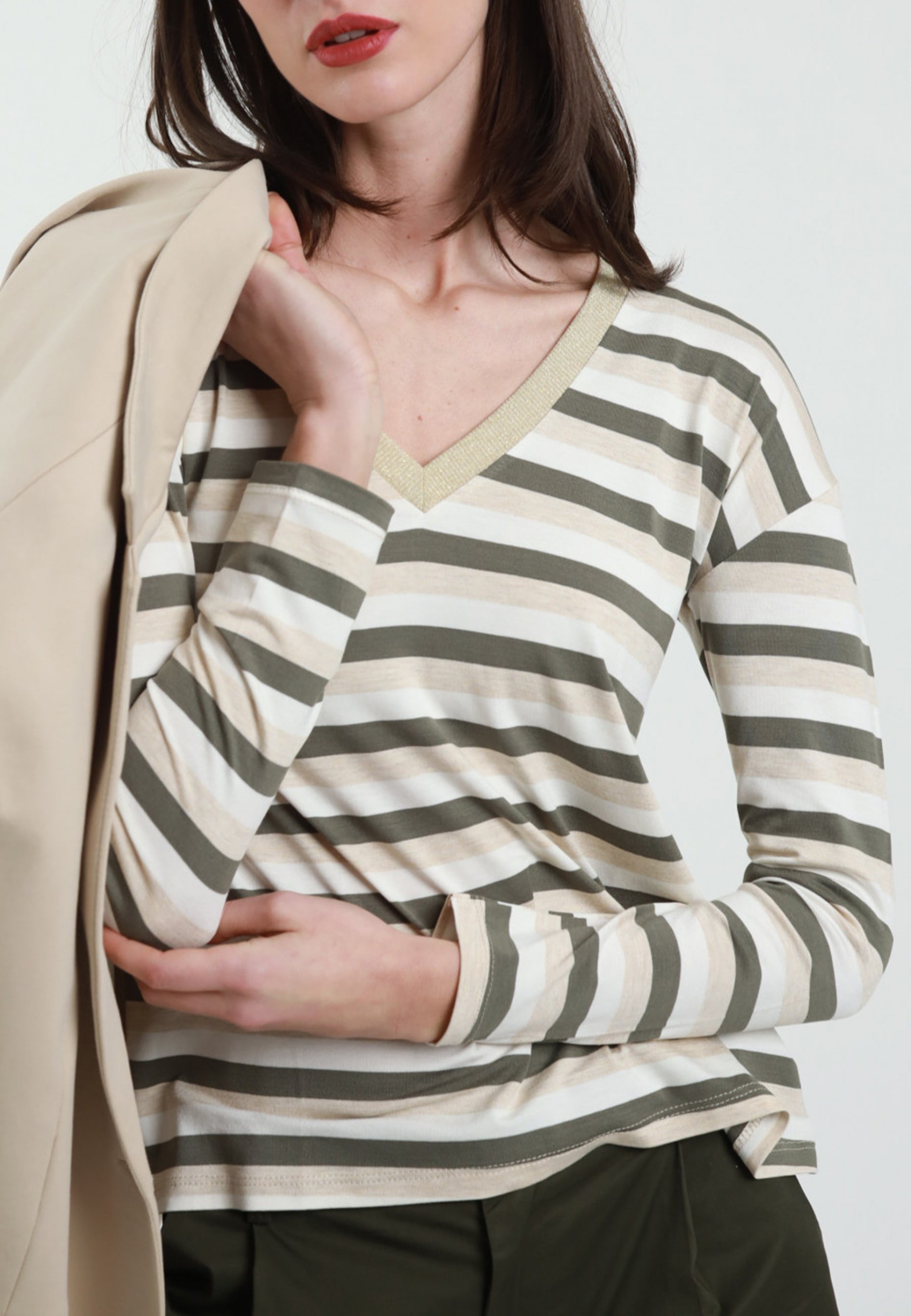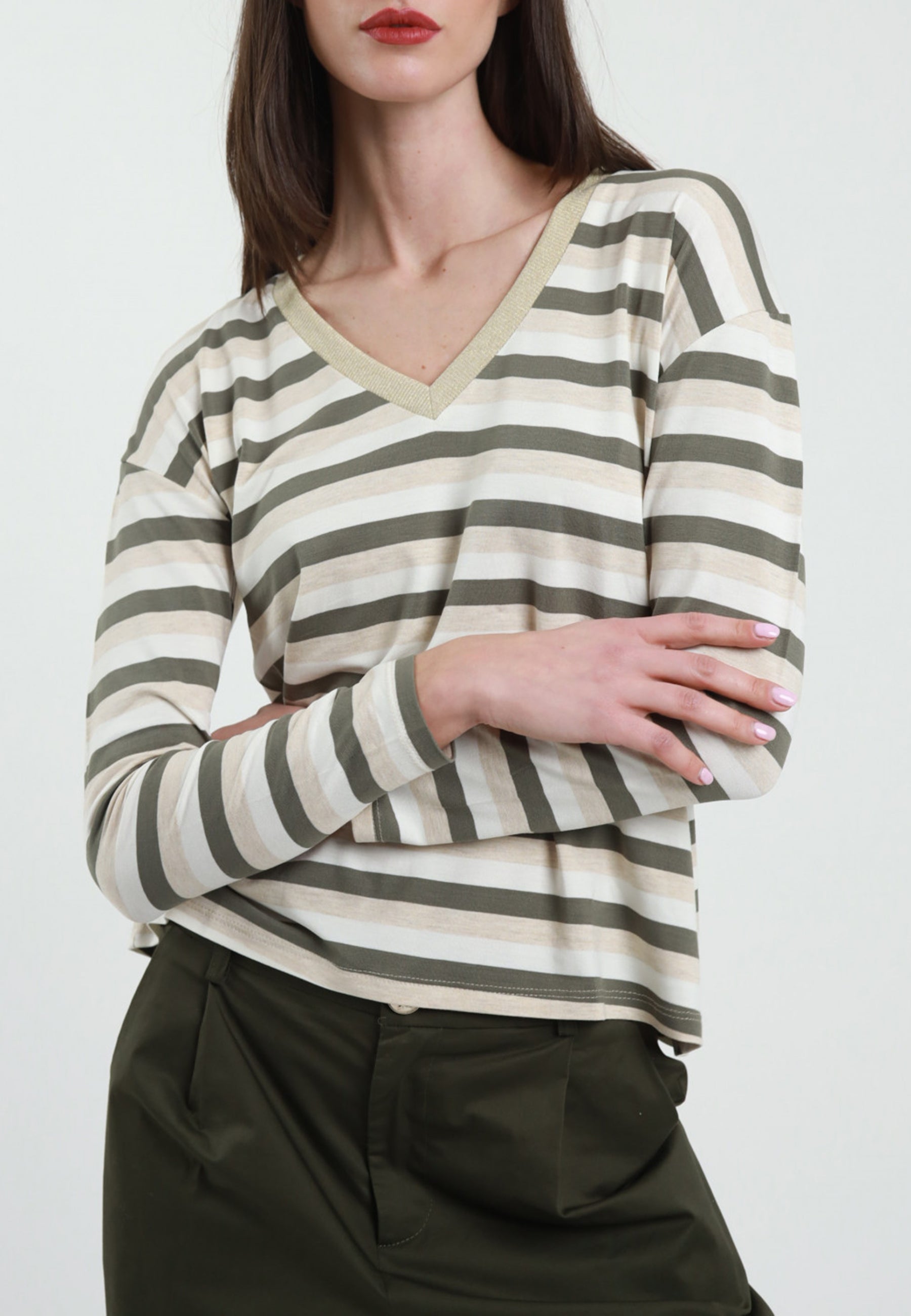 Scopri la maglia a righe a maniche lunghe di SUSY MIX, un capo essenziale per un look sofisticato e contemporaneo. Realizzata in morbida viscosa, questa maglia offre una vestibilità confortevole e leggera, perfetta per ogni stagione. Il design a righe aggiunge un tocco di dinamismo, mentre lo scollo a V valorizza la silhouette con eleganza. Il dettaglio in lurex sul bordo dona una nota luminosa e raffinata, rendendo questo capo ideale sia per un outfit casual che per un’occasione speciale. Abbinala ai tuoi jeans preferiti o a una gonna elegante per un look sempre impeccabile. Scopri ora la qualità e lo stile di SUSY MIX! Prodotto in Italia. Made in Italy