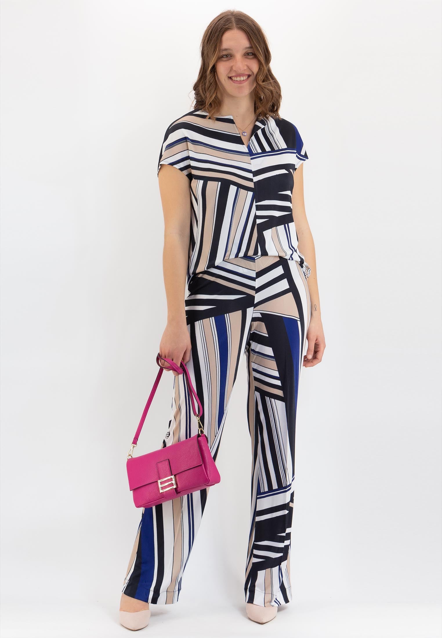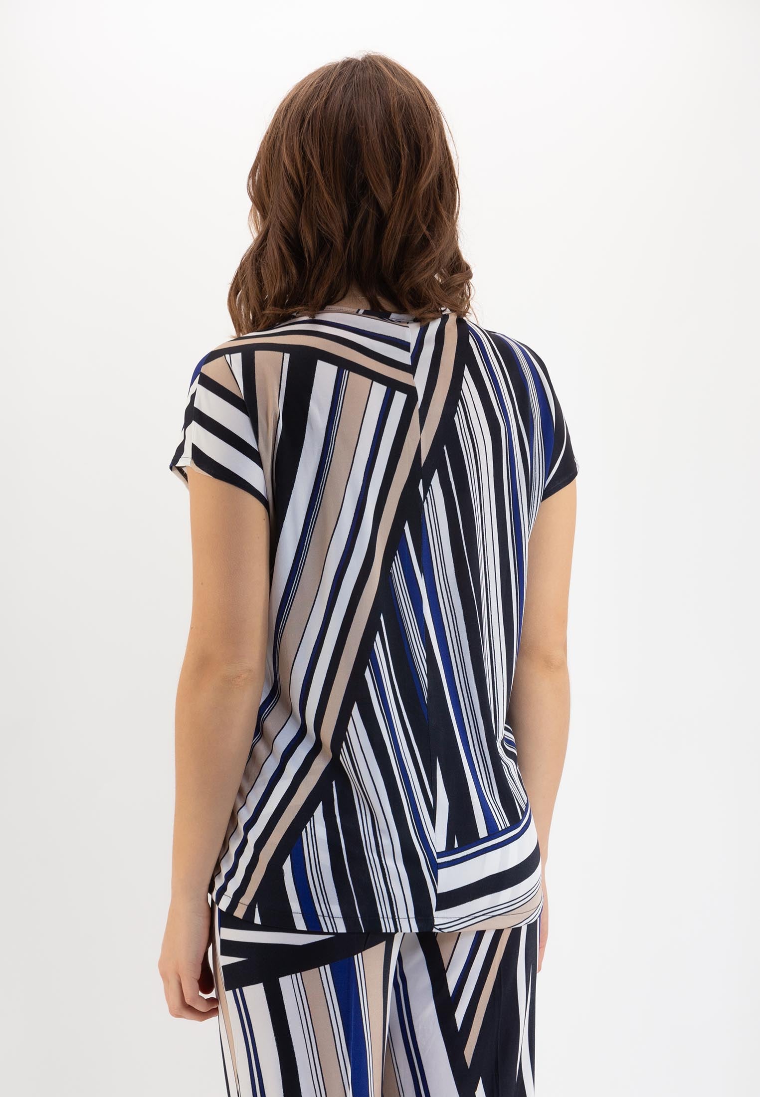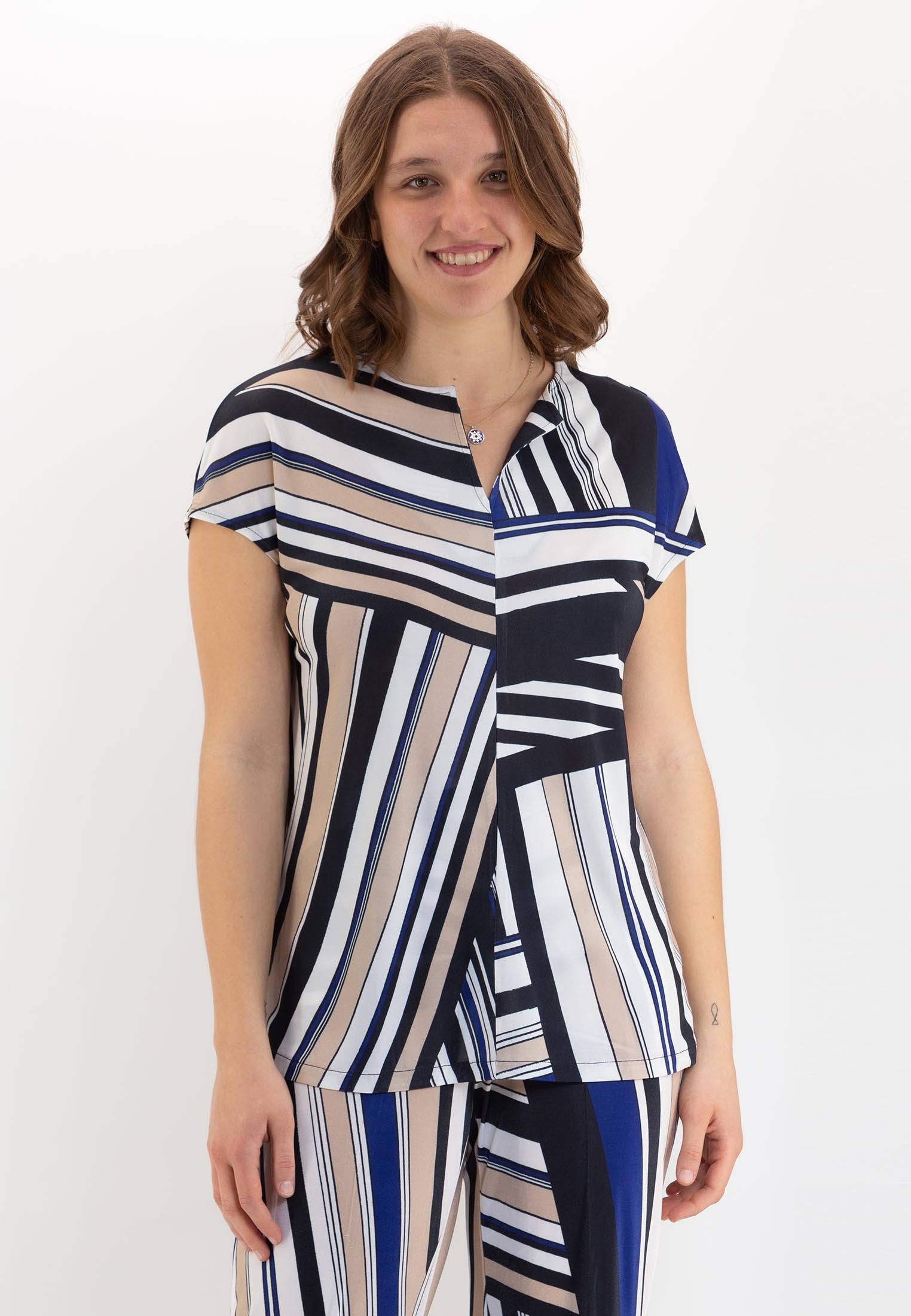 Maglietta da donna con stampa geometrica, manica corta, dettaglio V su girocollo, realizzato in freschissimo jersey elasticizzato di viscosa. La vestibilità è soft, caratterizzata da un fit generoso e cascante per vestire al meglio tutte le fisicità. E' l'ideale abbinata ai pantaloni Ragno con cui poter creare uno stile casual, elegante oppure più ricercato in base alla personalità di chi la indossa.