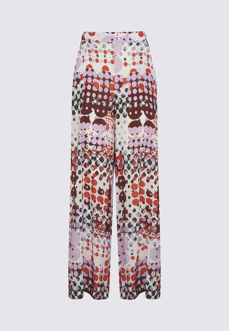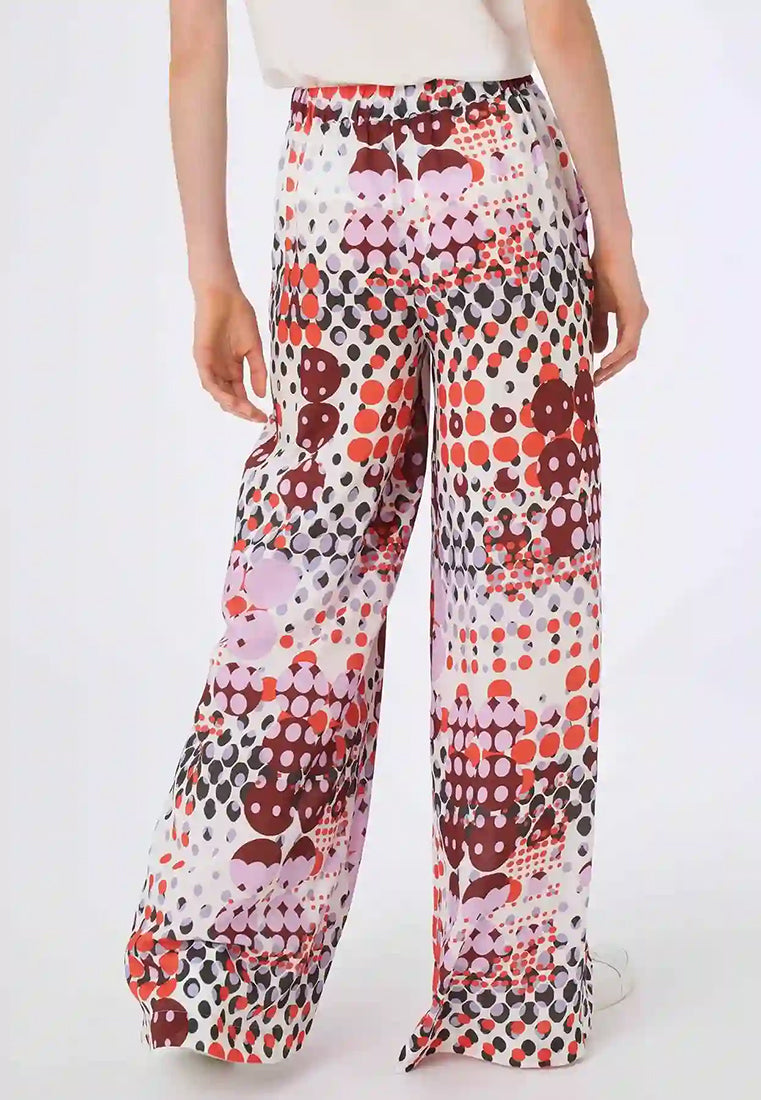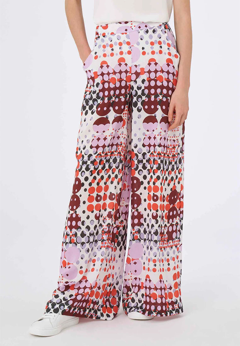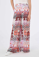 Pantalone a palazzo da donna con vita elasticizzata e tasche laterali con stampa geometrica stile 70's dalla vestibilità ampia, fluida e cascante. Realizzato in fresca e leggera mussola di viscosa, una fibra di origine cellulosica che unisce le migliori qualità della seta e del cotone.