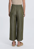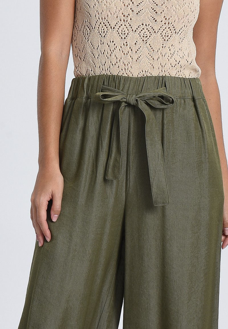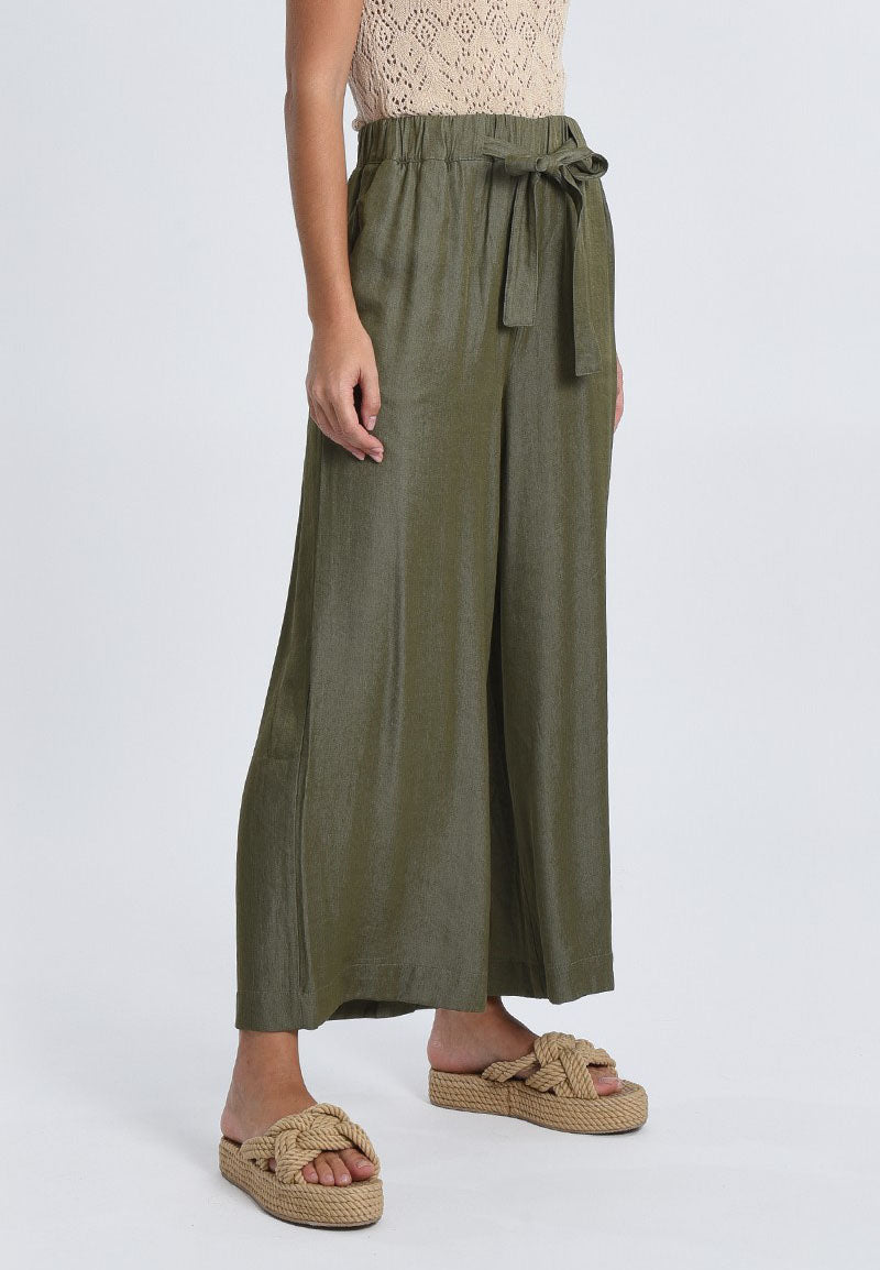Pantaloni a vita alta in materiale fluido con gamba svasata. Questi pantaloni hanno 2 tasche laterali e un elastico in vita con laccio. Lunghezza alla caviglia.