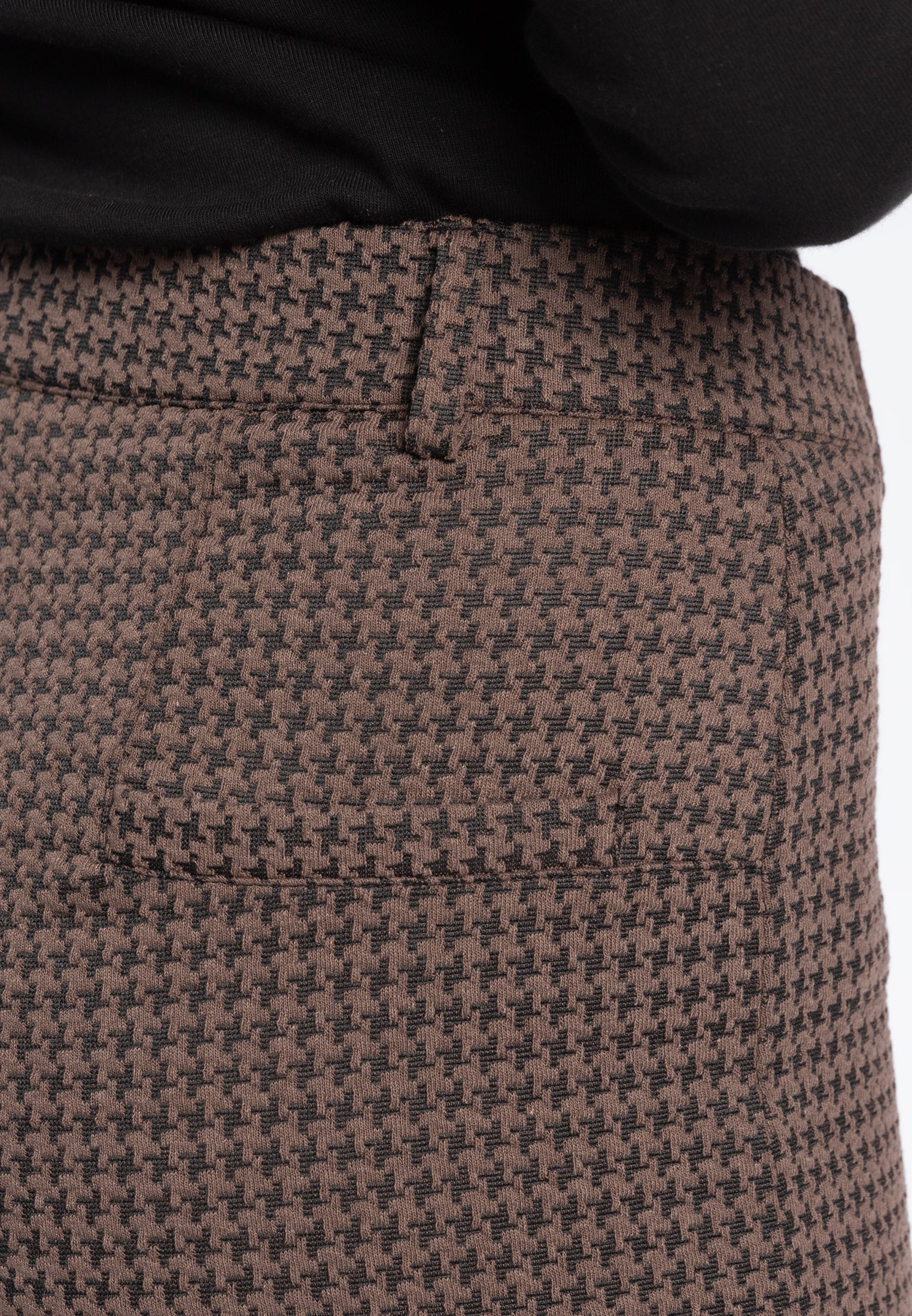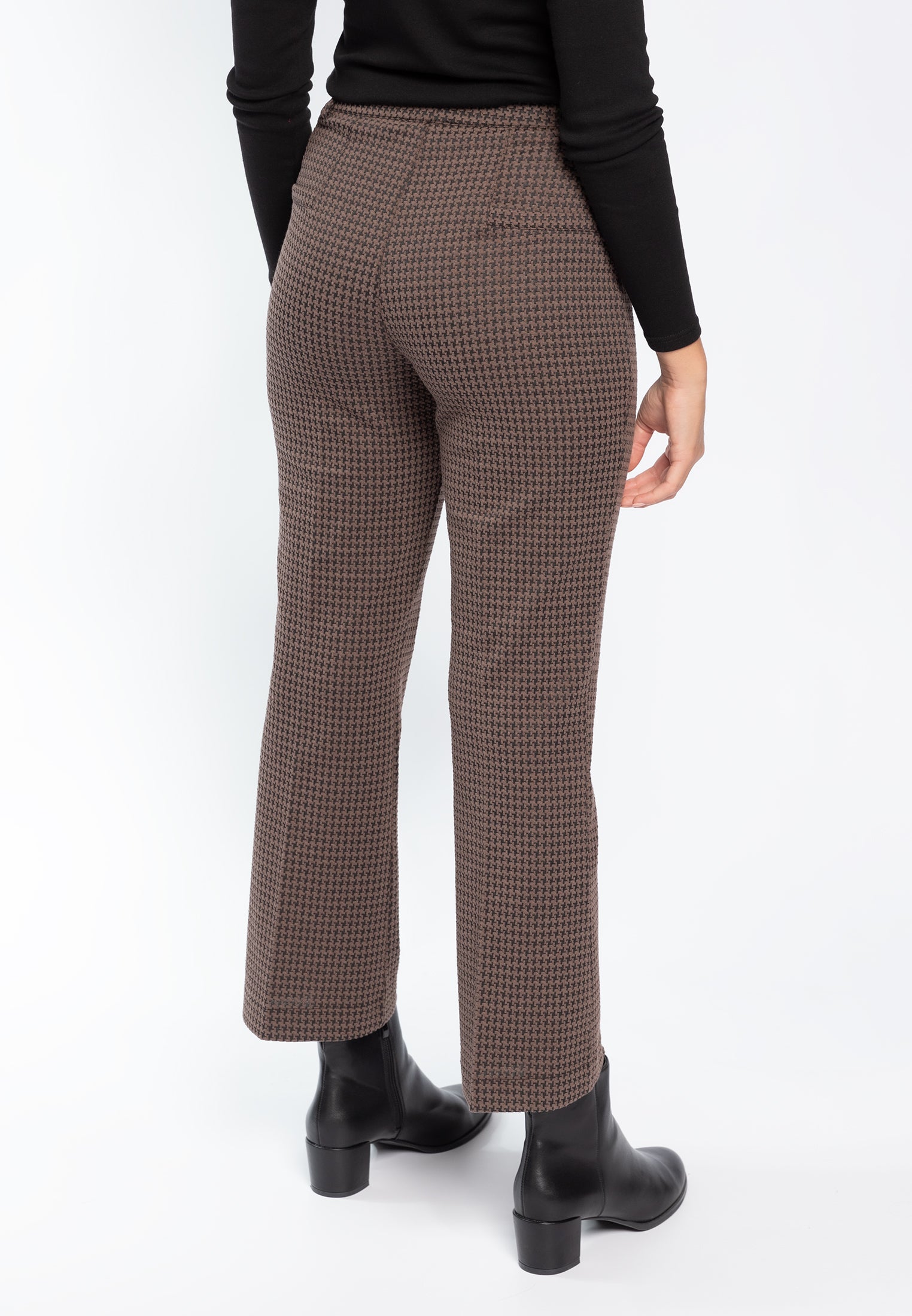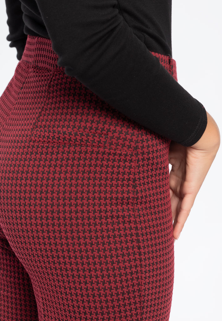 Pantalone trombetta nel più tradizionale stile anni '70 sempre attuale in micro fantasia pied de poule. Questo modello è costruito con vita elasticizzata con passanti, senza tasche, comodo come indossare un leggings pur mantenendo l'eleganza di un pantalone. Le tasche posteriori sono finte per offrire la giusta estetica senza inficiarne la vestibilità. Realizzato nell'esclusivo tessuto Compact, un punto Milano incredibilmente compatto ed elasticizzato, tanto da garantire sempre una vestibilità perfetta. Un pantalone ingualcibile e resistente, praticamente indistruttibile e ovviamente lavabile in lavatrice per la massima praticità.