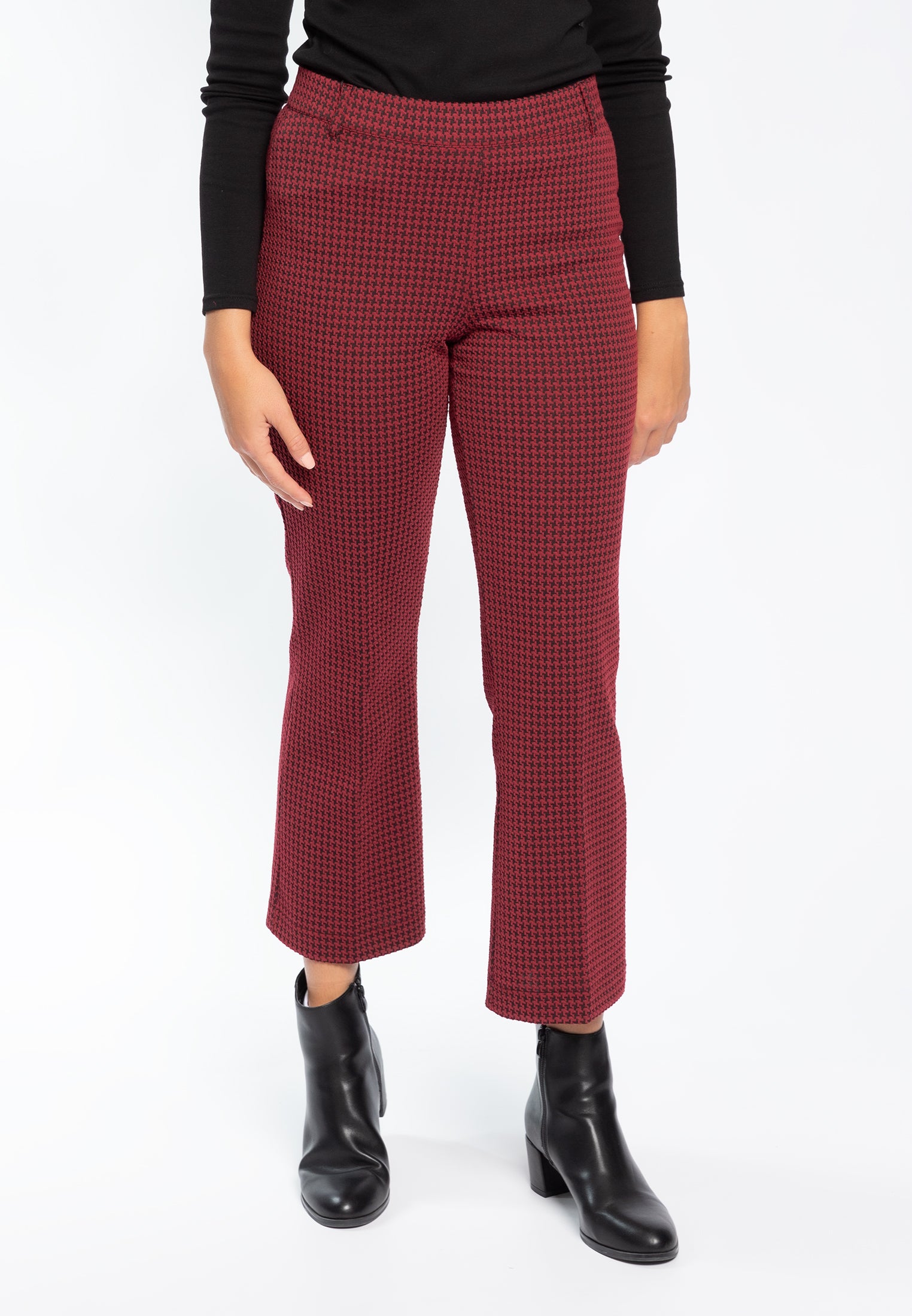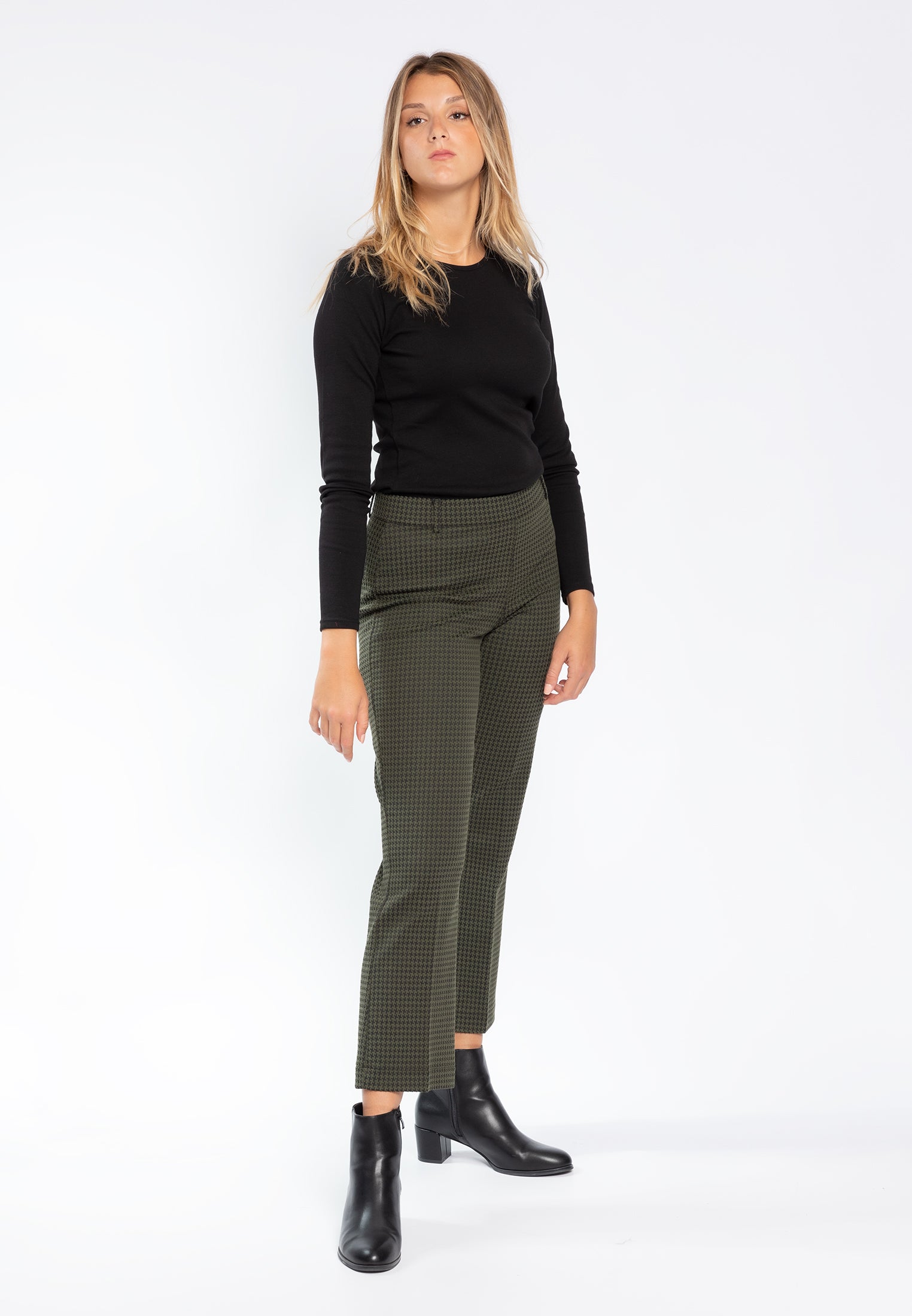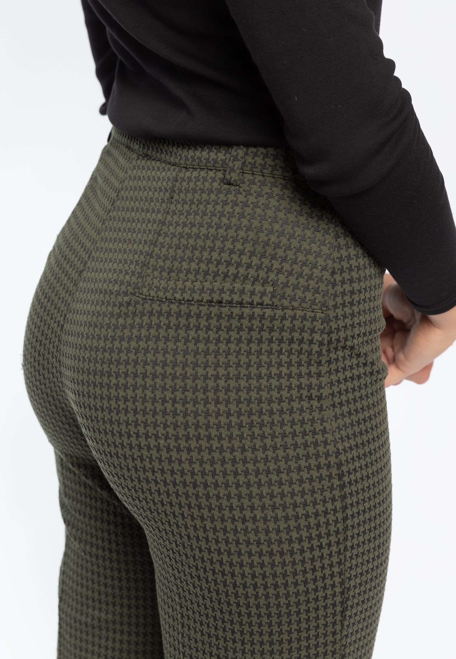 Pantalone trombetta nel più tradizionale stile anni '70 sempre attuale in micro fantasia pied de poule. Questo modello è costruito con vita elasticizzata con passanti, senza tasche, comodo come indossare un leggings pur mantenendo l'eleganza di un pantalone. Le tasche posteriori sono finte per offrire la giusta estetica senza inficiarne la vestibilità. Realizzato nell'esclusivo tessuto Compact, un punto Milano incredibilmente compatto ed elasticizzato, tanto da garantire sempre una vestibilità perfetta. Un pantalone ingualcibile e resistente, praticamente indistruttibile e ovviamente lavabile in lavatrice per la massima praticità.