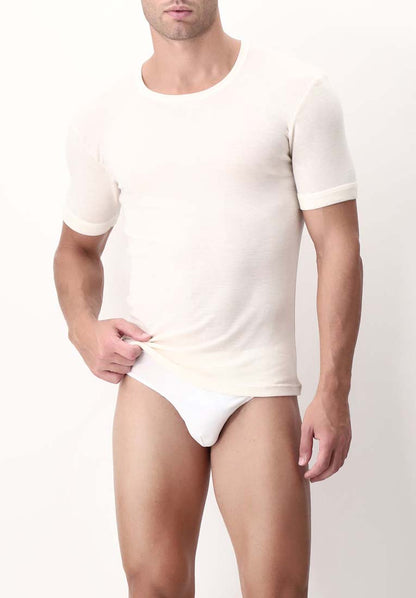 Maglietta girocollo con manica corta da uomo realizzata in lana e seta. La lana é antitarmica, antinfeltrente, irrestringibile e finissima. Il filo di Seta dona alla t-shirt un aspetto lucido e prezioso. Questa t-shirt offre il massimo comfort, calore e resistenza.