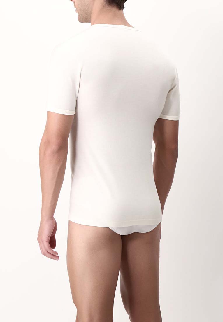 T-shirt mezza manica articolo MEZZA MANICA PIU VPRT00188. Ideale per la stagione invernale, per una piacevole sensazione di calore e comfort nelle giornate più fredde. In puro cotone a contatto diretto con la pelle e lana finissima e morbida all'esterno. Il filo di seta continuo rende il capo luminoso e pregiato. Senza cuciture sui fianchi.