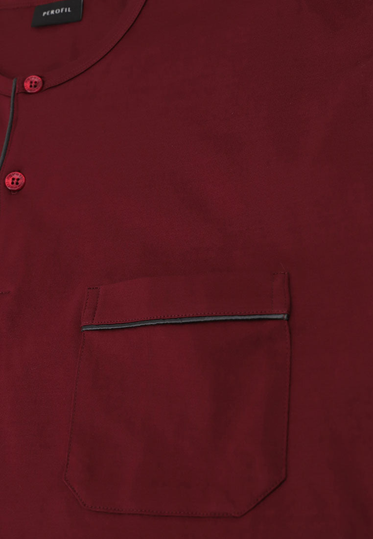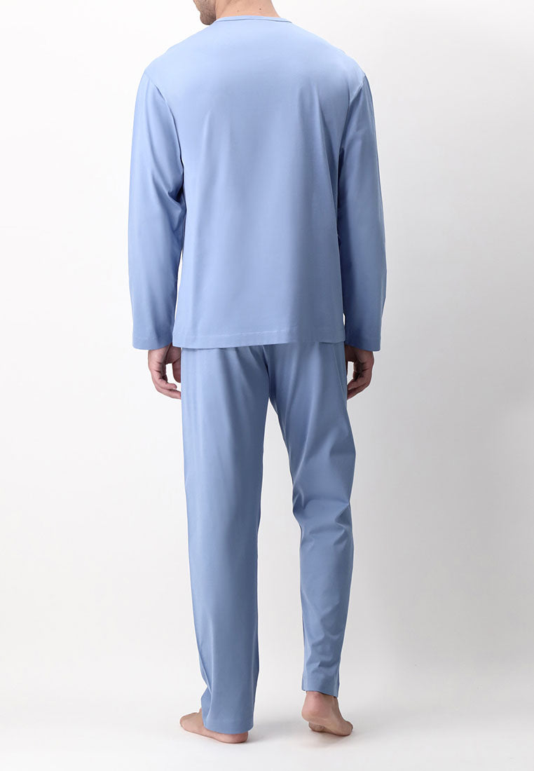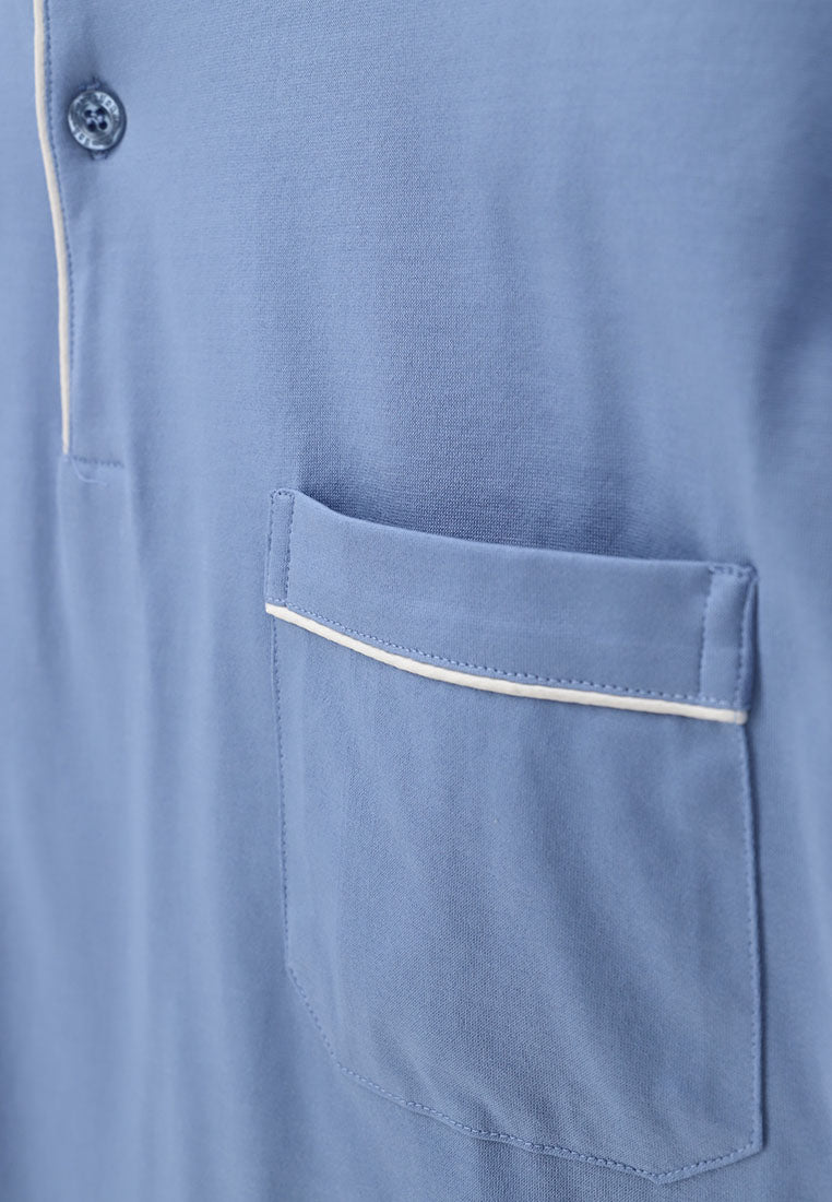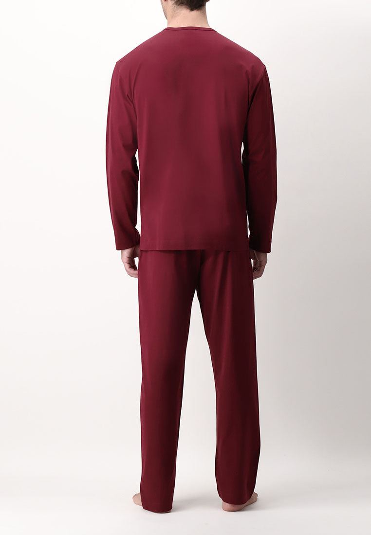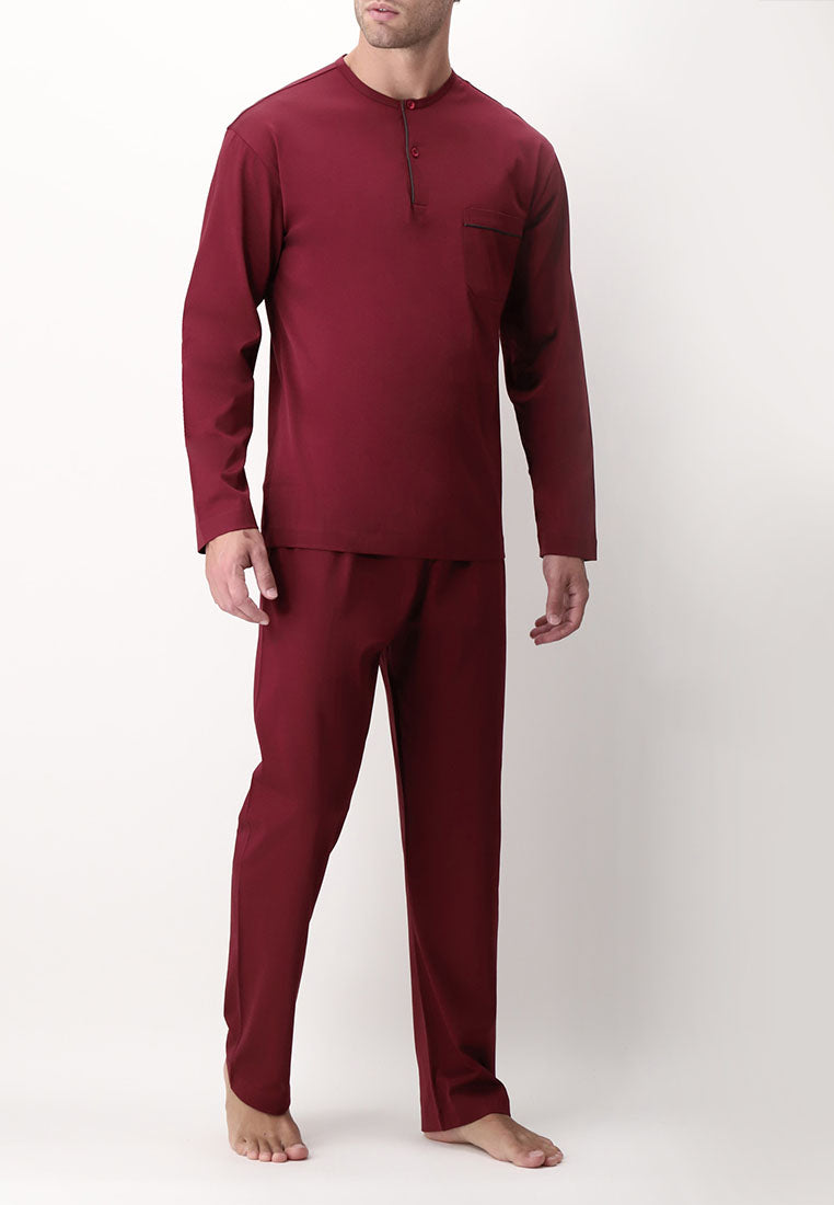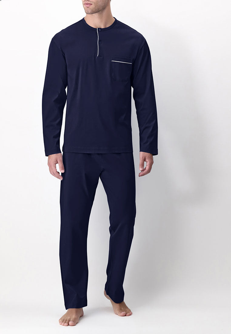 Pigiama manica lunga  in pregiato jersey mercerizzato Filo di Scozia, molto elegante il capo risulta lucente, resistente e irrestringibile. La maglia ha le maniche lunghe, il collo serafino e una taschina. Questo pigiama offre il massimo comfort grazie alla sua vestibilità morbida.