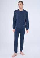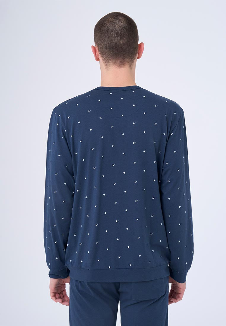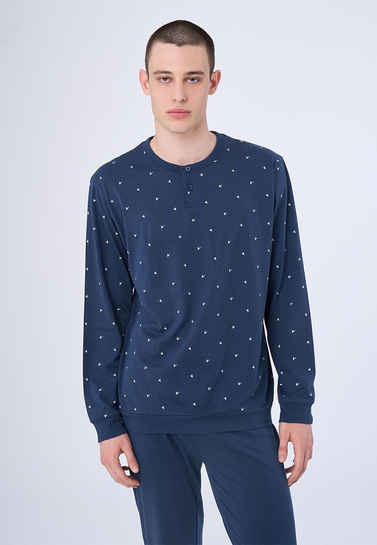 Il pigiama lungo da uomo a serafino in jersey di 100% cotone. La casacca, con due bottoncini, è presentata in tinta unita blu con una stampa micro all-over in contrasto. Il pantalone, tinta unita blu, è lungo con polsini alla caviglia. La vestibilità è comoda e avvolgente, grazie alla morbidezza del tessuto.