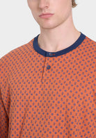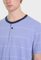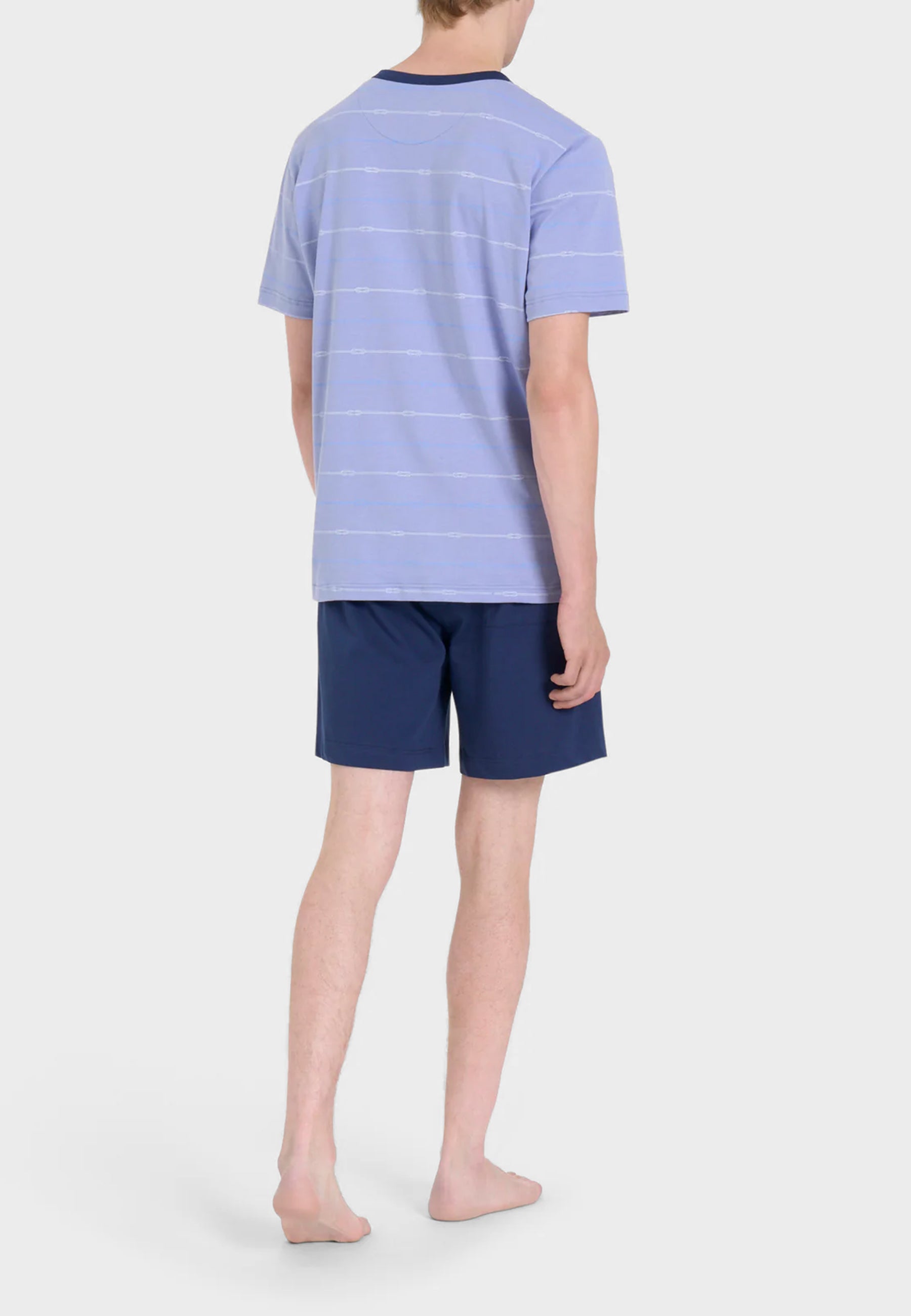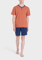 Il pigiama corto da uomo di RAGNO unisce comfort e stile per garantire il massimo benessere durante il riposo. Realizzato in fresco jersey di cotone, è perfetto per le stagioni più calde grazie alla sua leggerezza e traspirabilità. La maglia a maniche corte con collo a serafino si distingue per il motivo a righe nautiche, che dona un tocco di eleganza informale, mentre il pantalone corto in tinta unita completa il look con semplicità e praticità. La presenza di una tasca posteriore aggiunge un dettaglio funzionale, ideale per chi cerca comodità senza rinunciare allo stile. Perfetto per chi desidera un pigiama di qualità, questo modello è pensato per offrire freschezza e libertà di movimento in ogni momento della notte.