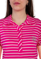 Polo donna in viscosa rigata leggera e fresca, perfetta per l'estate. La mezza manica aggiunge un tocco di eleganza. Realizzata con morbido tessuto, ideale per chi cerca il massimo comfort. Perfetta per ogni occasione. Capo prodotto in Italia. Made in Italy