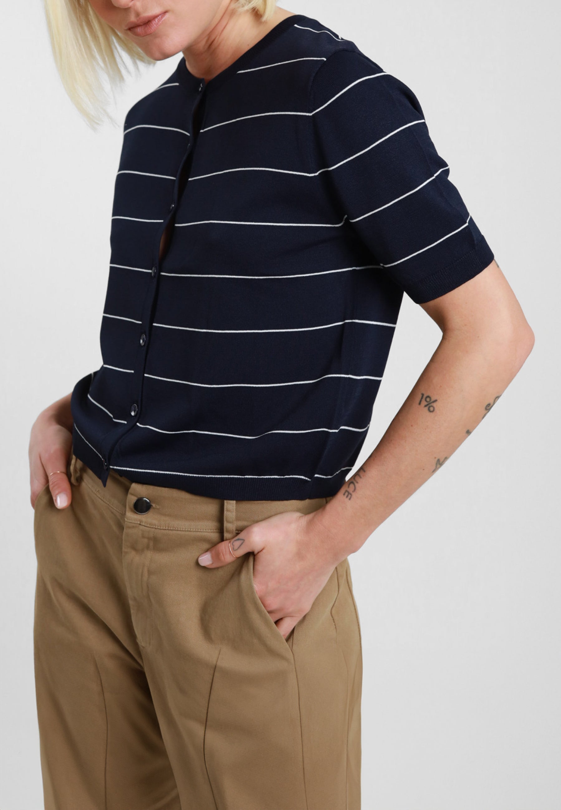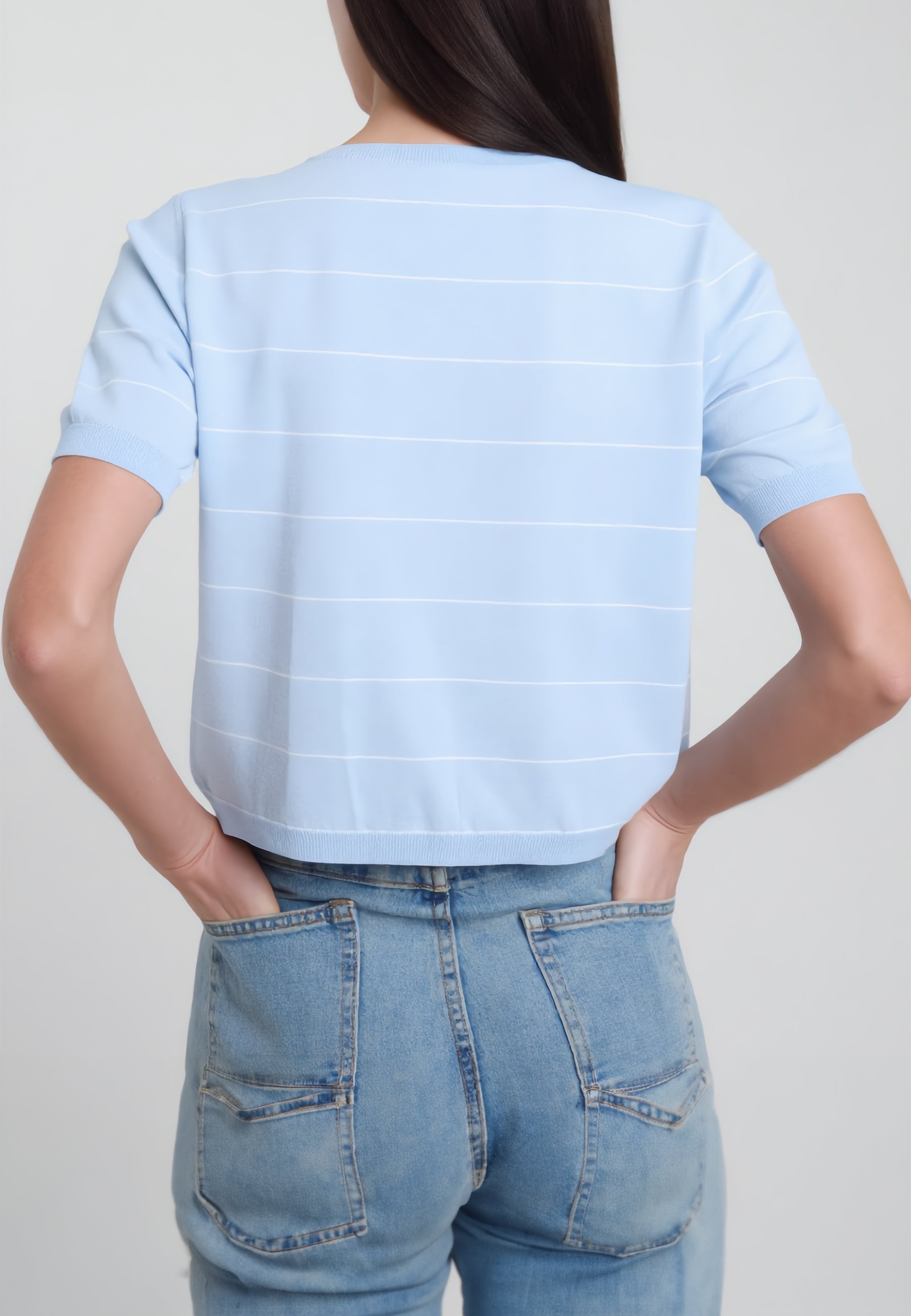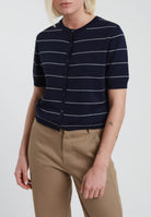Cardigan donna SUSY MIX in viscosa dalla linea essenziale e contemporanea, ideale per completare con leggerezza il guardaroba della stagione estiva. La lavorazione in maglia a righe dona al capo un aspetto dinamico e raffinato, perfetto per chi ama uno stile casual curato ma sempre femminile. Il design con maniche corte e apertura frontale con bottoni rende questo modello pratico e versatile, mentre il colletto alla coreana aggiunge un dettaglio moderno che valorizza l’insieme con discrezione. La vestibilità morbida accompagna la silhouette senza costringerla, offrendo comfort quotidiano e facilità di abbinamento con pantaloni, denim o gonne dal taglio pulito. In pieno stile SUSY MIX, questo cardigan unisce gusto attuale, semplicità e ricercatezza, risultando adatto sia per outfit informali sia per look più ordinati da giorno. Un capo femminile e trasversale, pensato per vestire con naturalezza e stile nei mesi più miti.