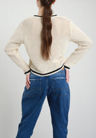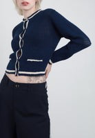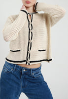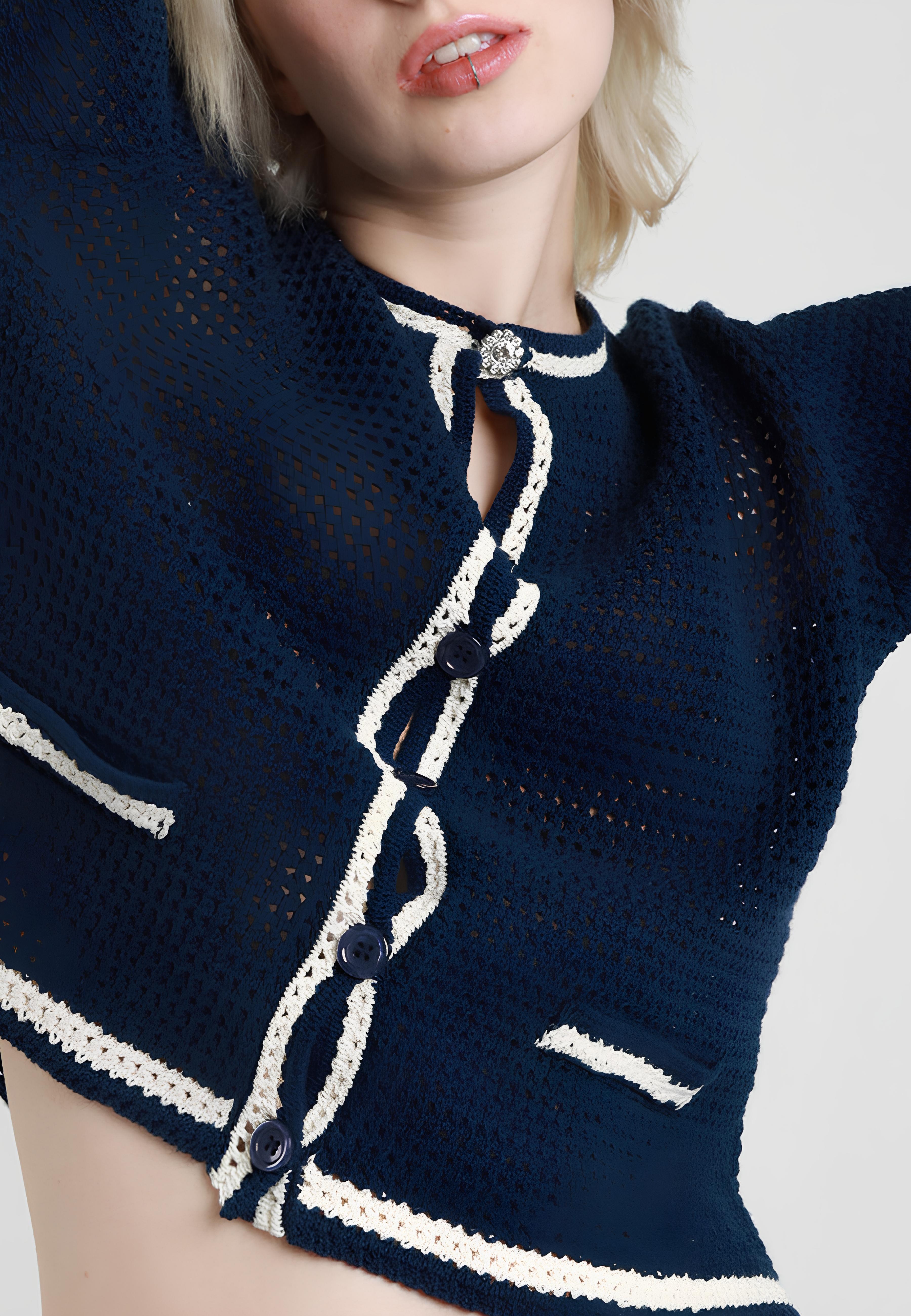 Cardigan donna SUSY MIX dal gusto contemporaneo e ricercato, perfetto per completare outfit femminili con un tocco distintivo e versatile. Il modello traforato dona leggerezza visiva al capo e lo rende ideale per la stagione estiva, mentre la linea morbida accompagna la silhouette con naturalezza. I bordi a contrasto valorizzano il design con un dettaglio grafico elegante e moderno, capace di dare carattere anche agli abbinamenti più semplici. La chiusura frontale con bottoni aggiunge praticità, mentre il bottone gioiello sullo scollo impreziosisce il cardigan con un accento raffinato e luminoso. Facile da indossare su top, t-shirt o abiti leggeri, è un capo pensato per il guardaroba quotidiano ma adatto anche a occasioni più curate. Questo cardigan donna interpreta perfettamente lo stile SUSY MIX, unendo comfort, femminilità e dettagli attuali in una proposta versatile, fresca e sempre piacevole da abbinare. Ideale per chi cerca un capo leggero e originale, capace di valorizzare il look con semplicità e personalità.