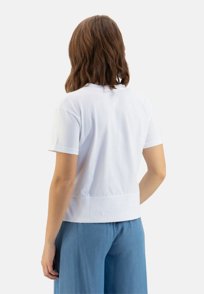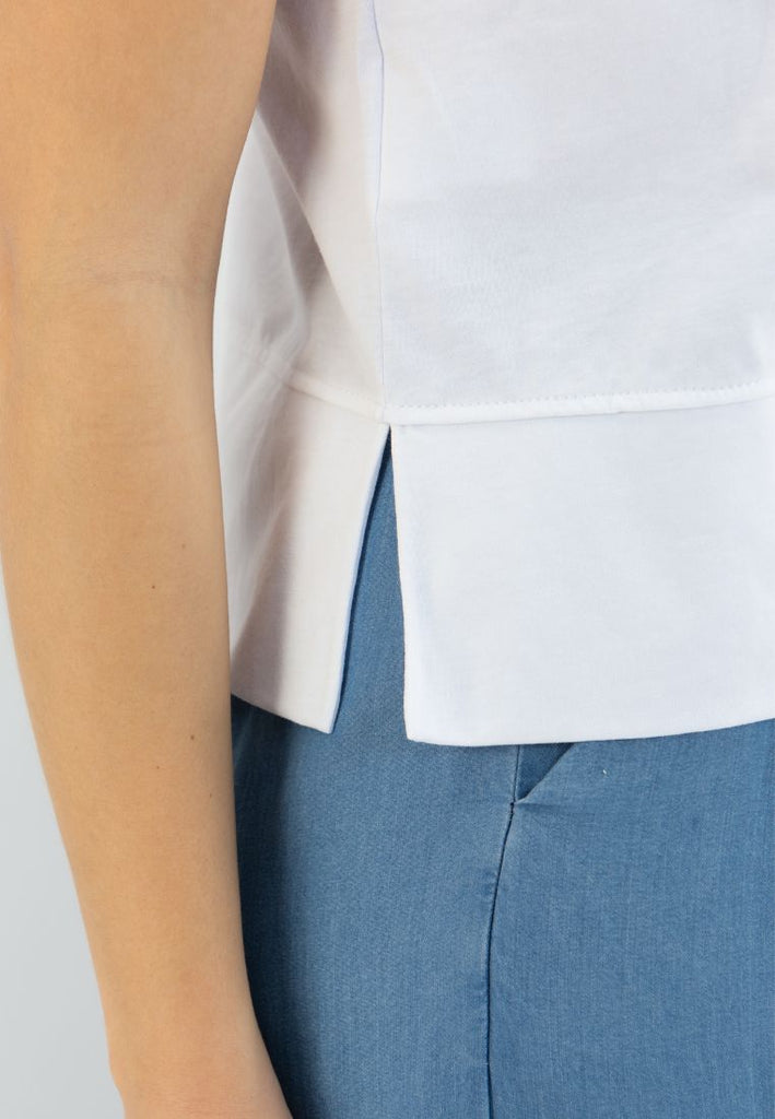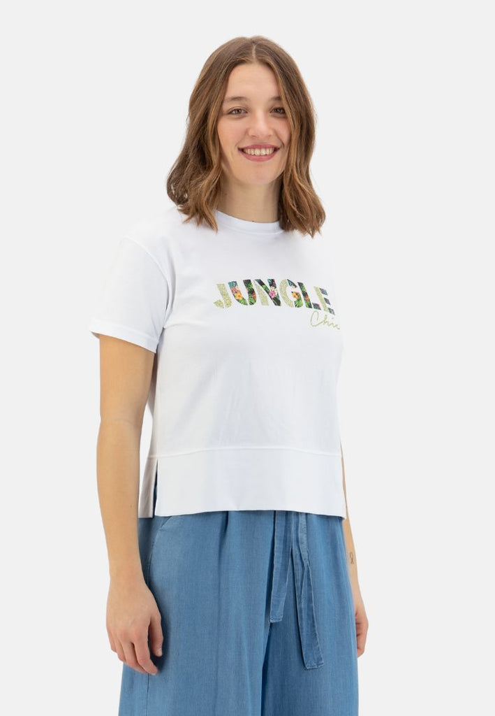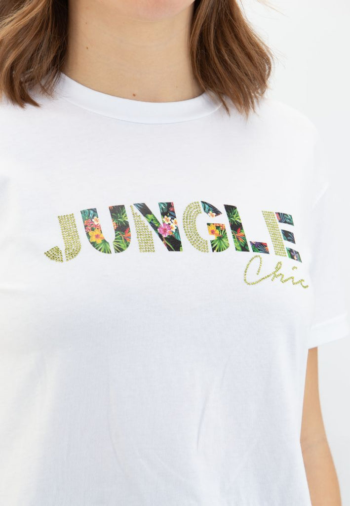 T-shirt bianca mezza manica con spacchetti laterali, stampa piazzata JUNGLE con stampa tropicale e dettagli di brillantini.