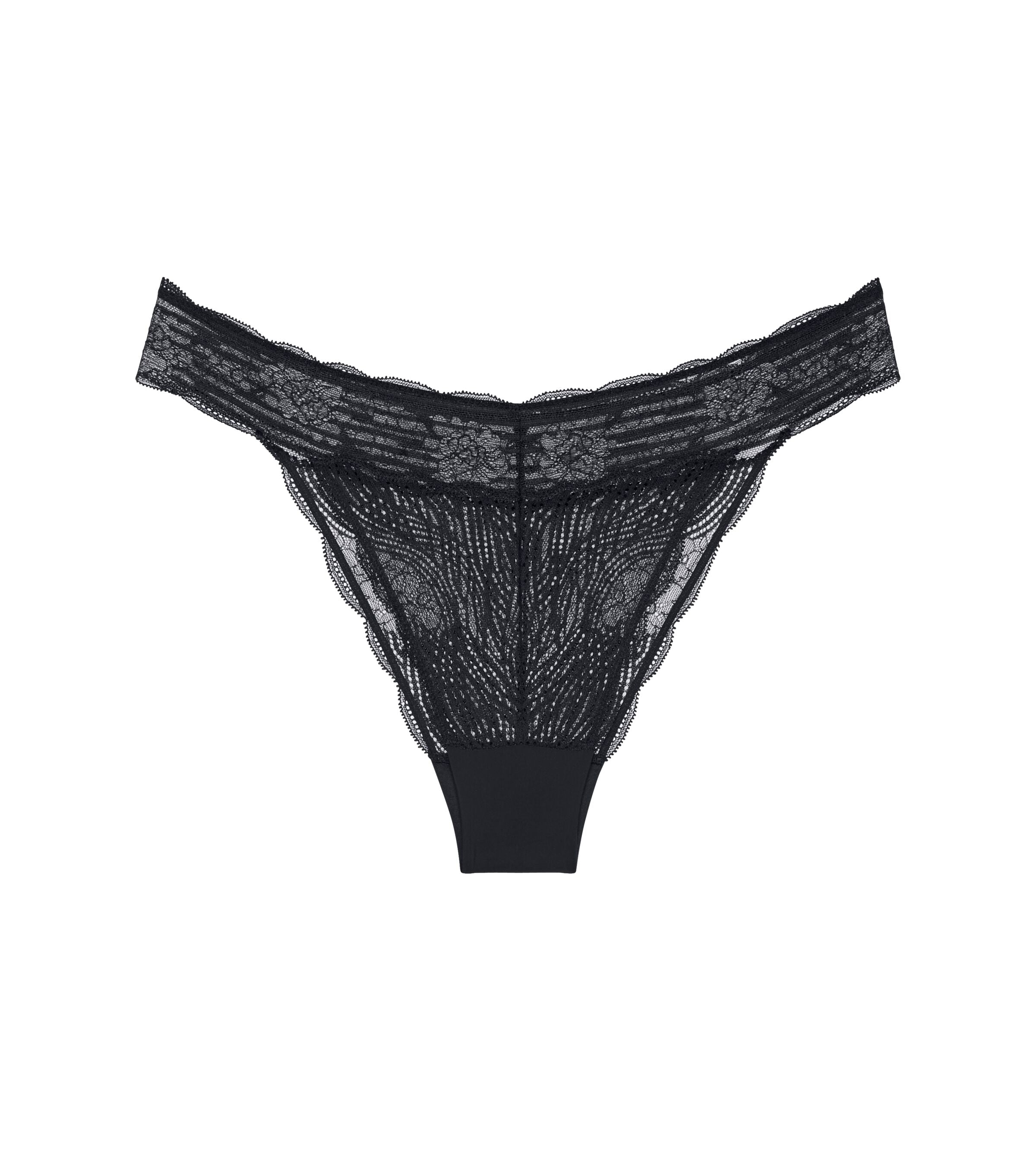 Slip brasiliano sgambato realizzato in un pizzo riciclato morbido ed elasticizzato. Progettato per valorizzare qualsiasi fisico grazie all'assenza di cuciture