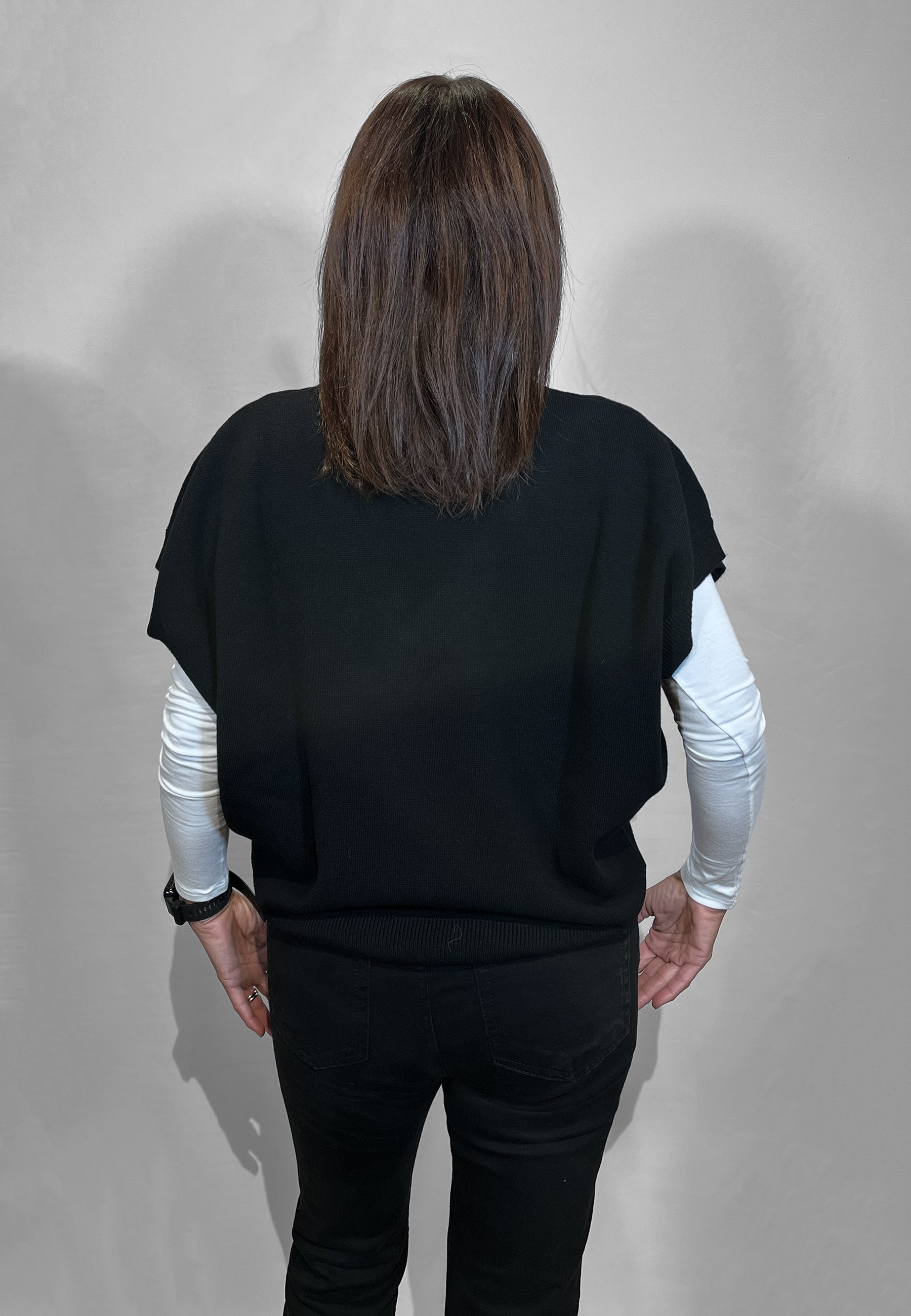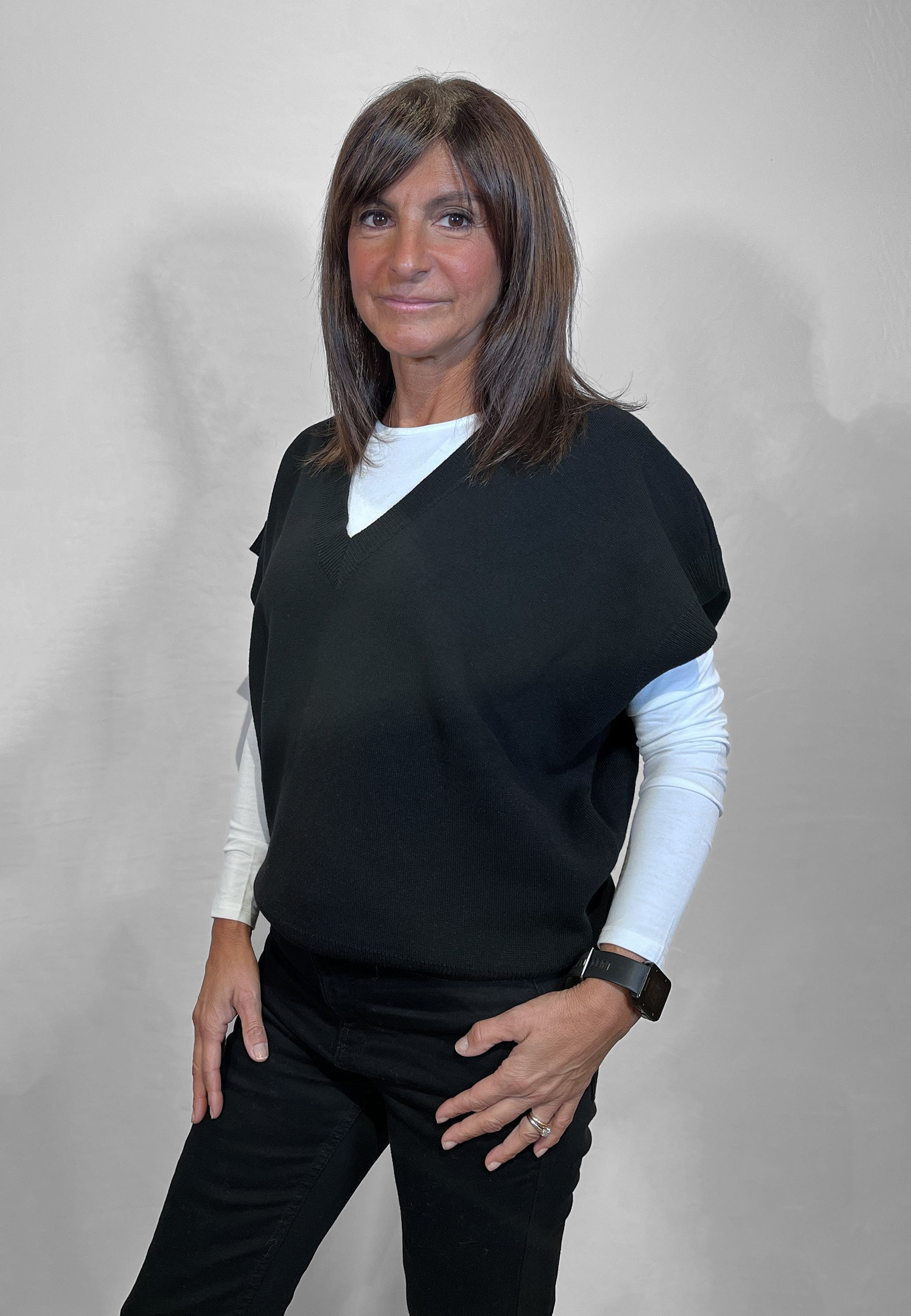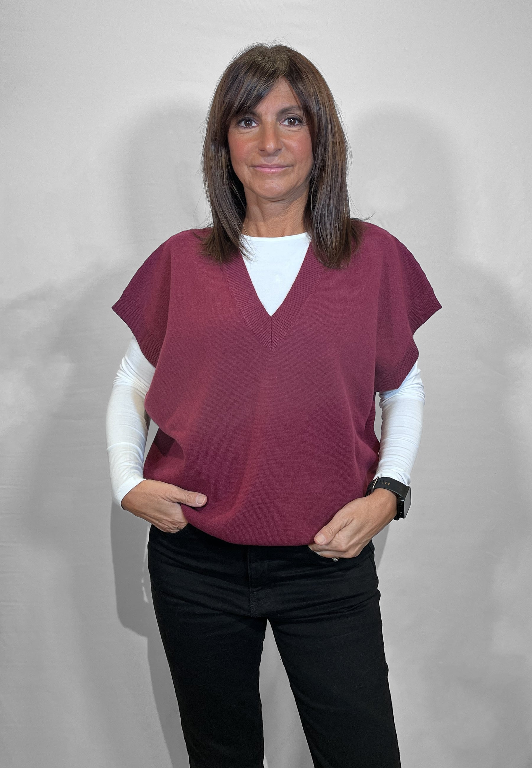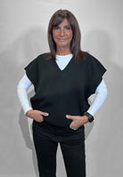 Il gilet in maglia Vicolo da donna è un capo caldo e versatile, perfetto per creare look a strati durante la stagione autunno inverno. La linea over con scollo a V valorizza la silhouette e permette di indossarlo comodamente sopra camicie, dolcevita o abiti, aggiungendo un tocco contemporaneo all'outfit. Il filato con lana e cashmere garantisce morbidezza e una piacevole sensazione avvolgente, ideale per le giornate più fredde. I bordi lavorati rifiniscono il modello con cura, rendendo questo gilet in maglia una scelta ideale per chi cerca un capo pratico ma ricercato. Un gilet donna invernale perfetto per completare look casual chic e office wear.