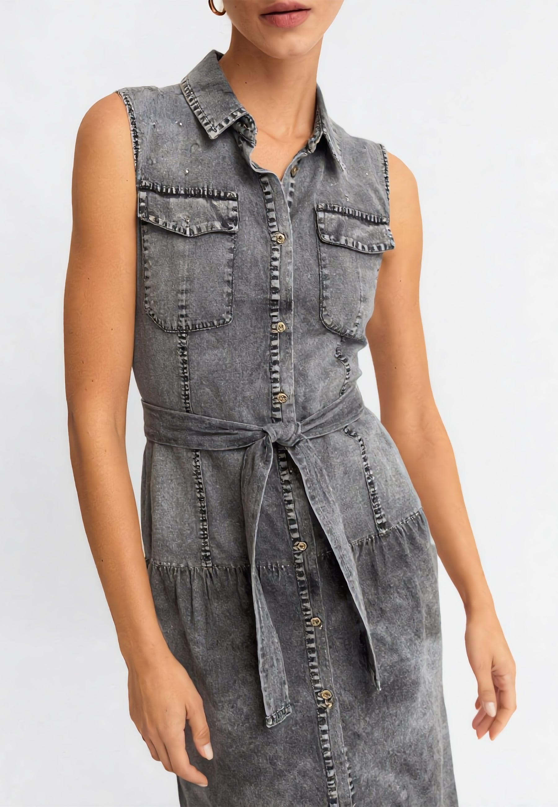Questo abito donna firmato Yes Zee interpreta il denim in chiave contemporanea, combinando carattere deciso e dettagli raffinati. Il design lungo e smanicato, con apertura frontale, crea una linea slanciata e pratica, ideale per affrontare la giornata con disinvoltura e stile. Le tasche applicate aggiungono funzionalità e un tocco casual, mentre la cintura con perline applicate valorizza il punto vita, donando femminilità e personalità al capo.